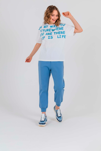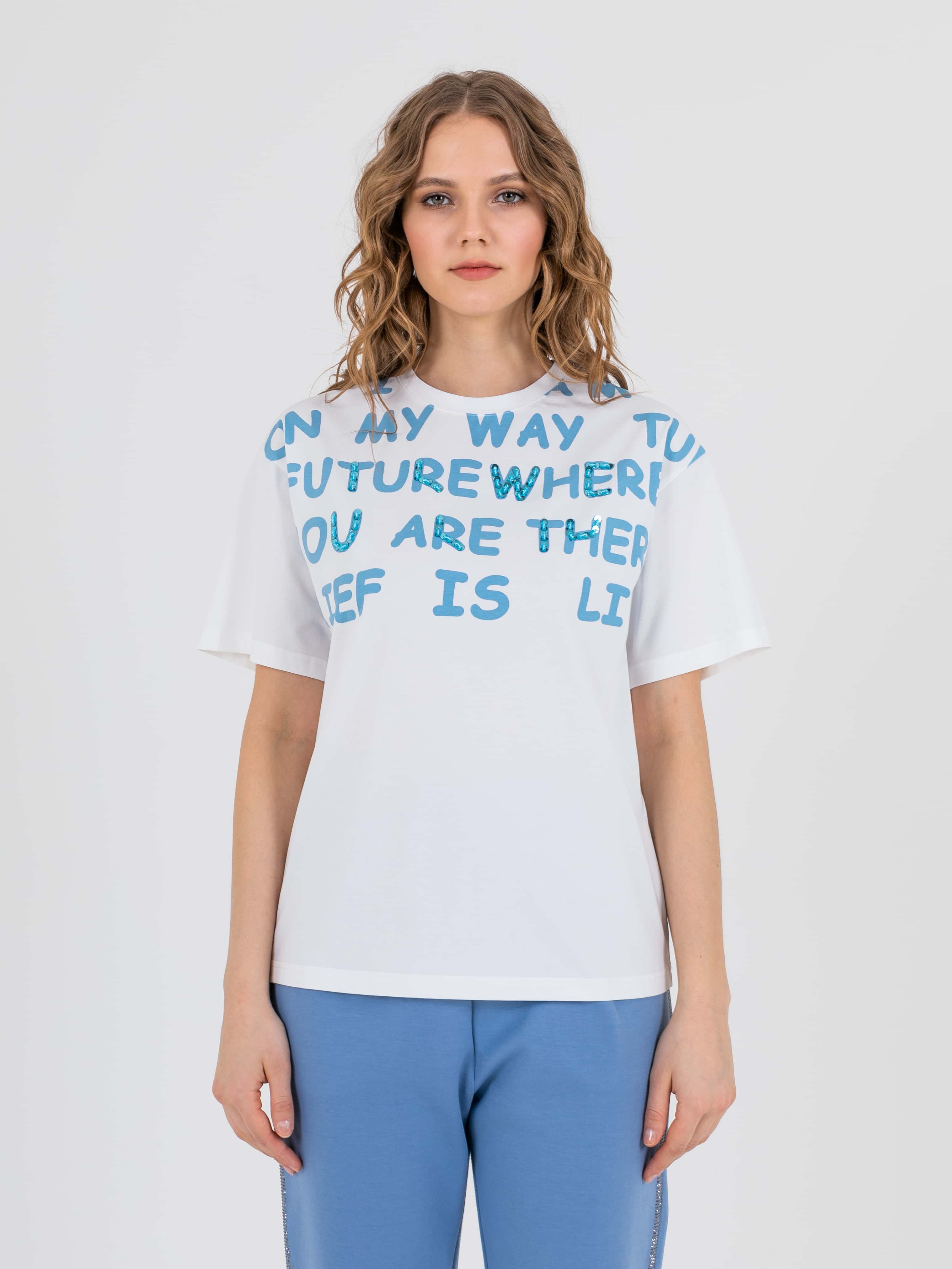 Футболка средней длины прямого силуэта из легкого хлопка с добавлением кукурузы. По переду выполнен яркий принт с вышивкой пайетками. Укороченные втачные рукава со спущенной линией плеча. Круглый вырез горловины.