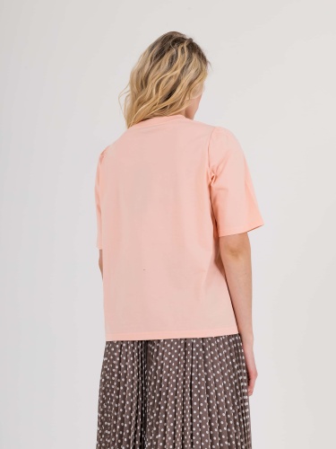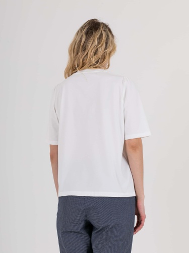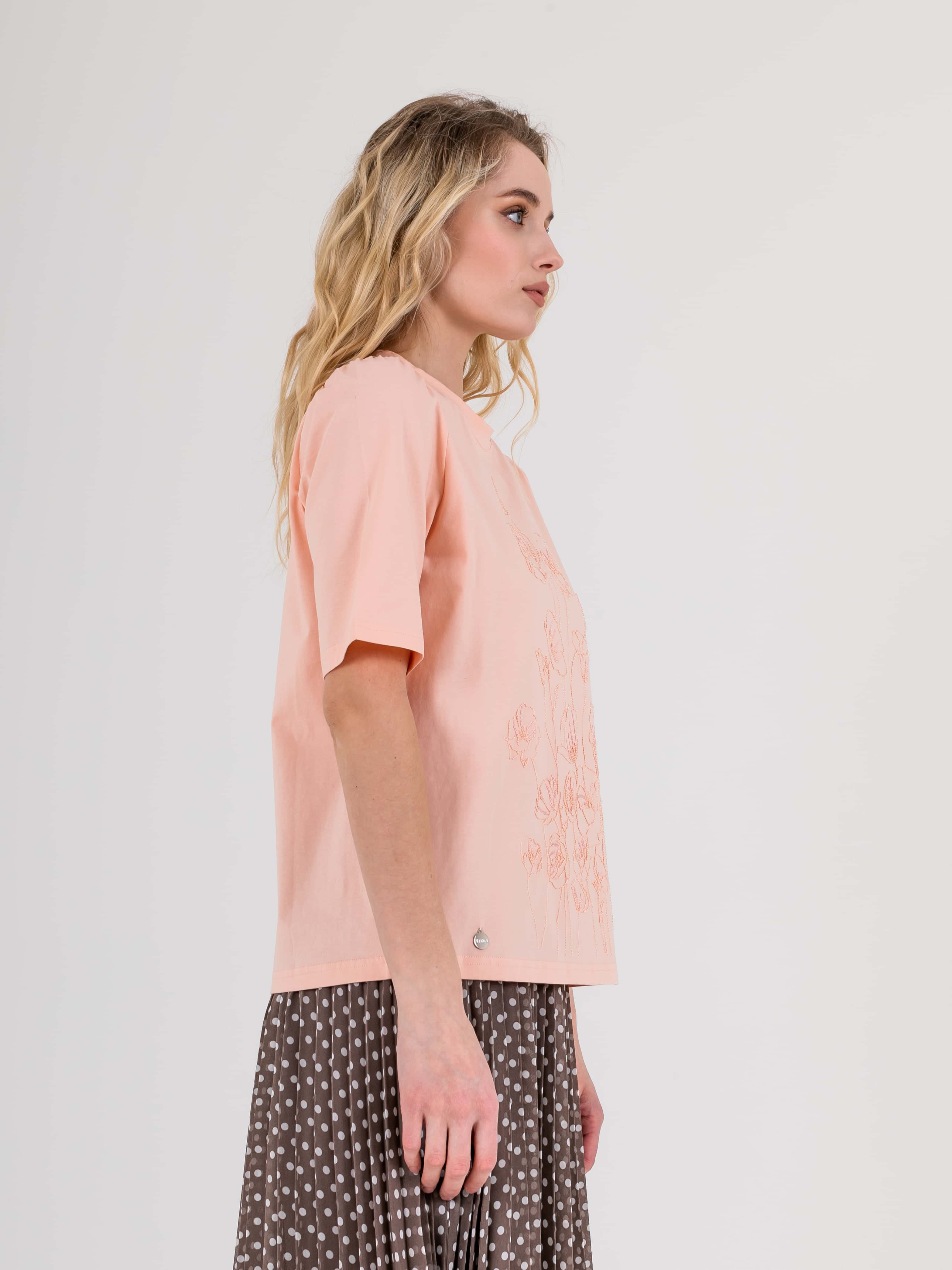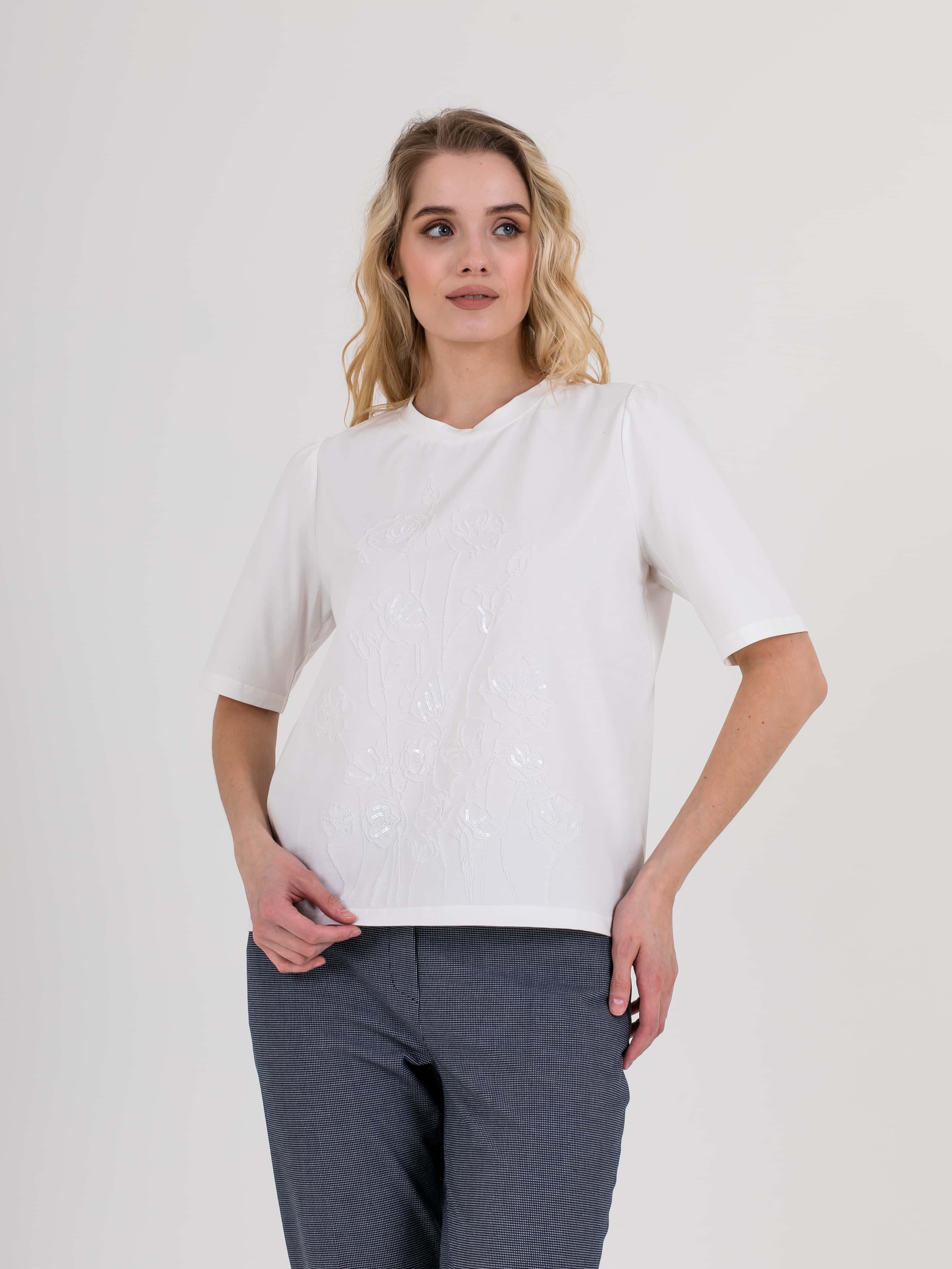 Укороченная футболка прямого силуэта из легкого хлопка с добавлением спандекса. По переду выполнена нежная вышивка. Укороченные втачные рукава с небольшой сборкой по пройме. Круглый вырез горловины.
