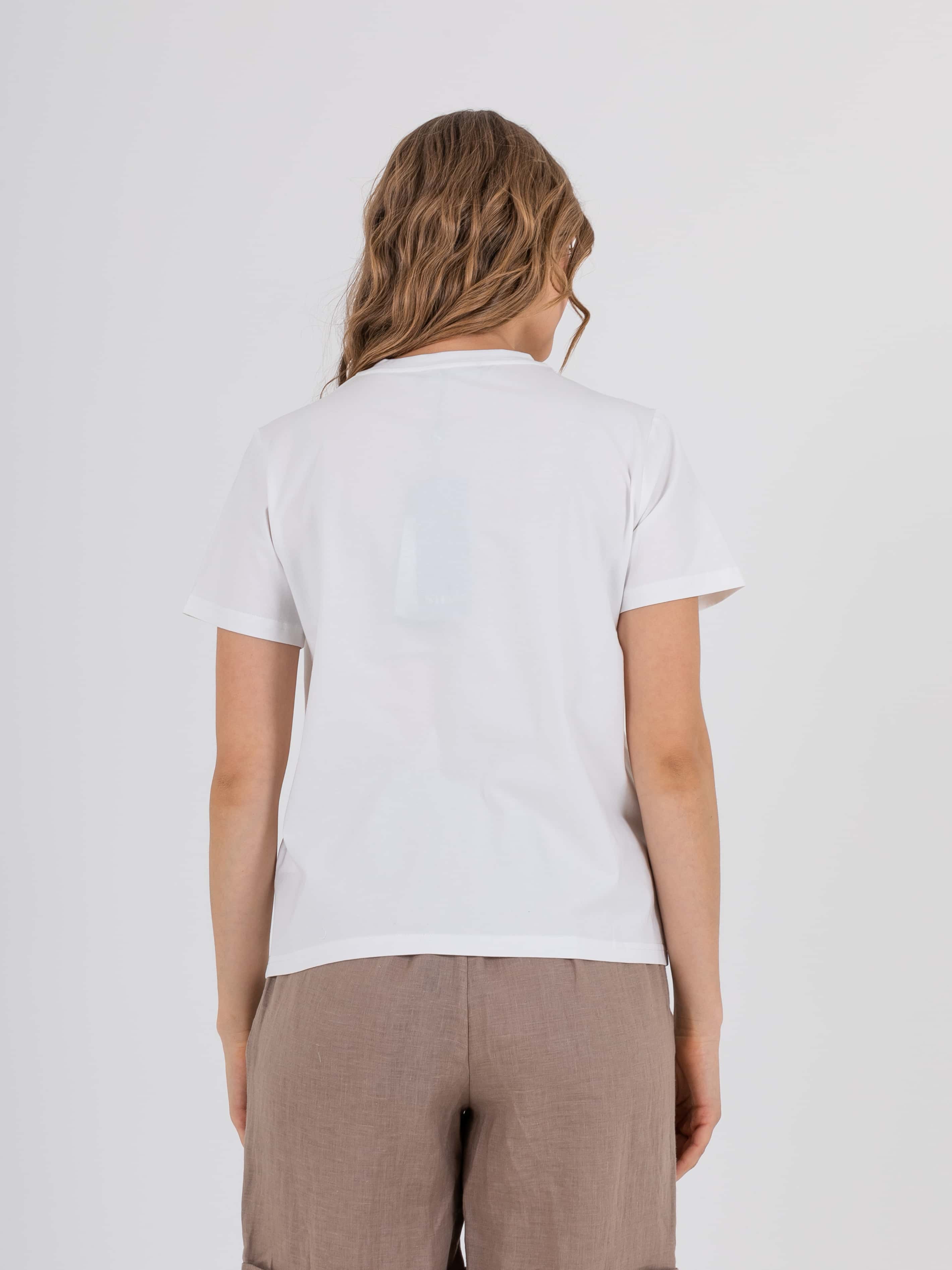 Укороченная футболка прямого силуэта из легкого хлопка с добавлением спандекса. По переду выполнен яркий принт с вышивкой пайетками и стразами. Укороченные втачные рукава. Круглый вырез горловины.