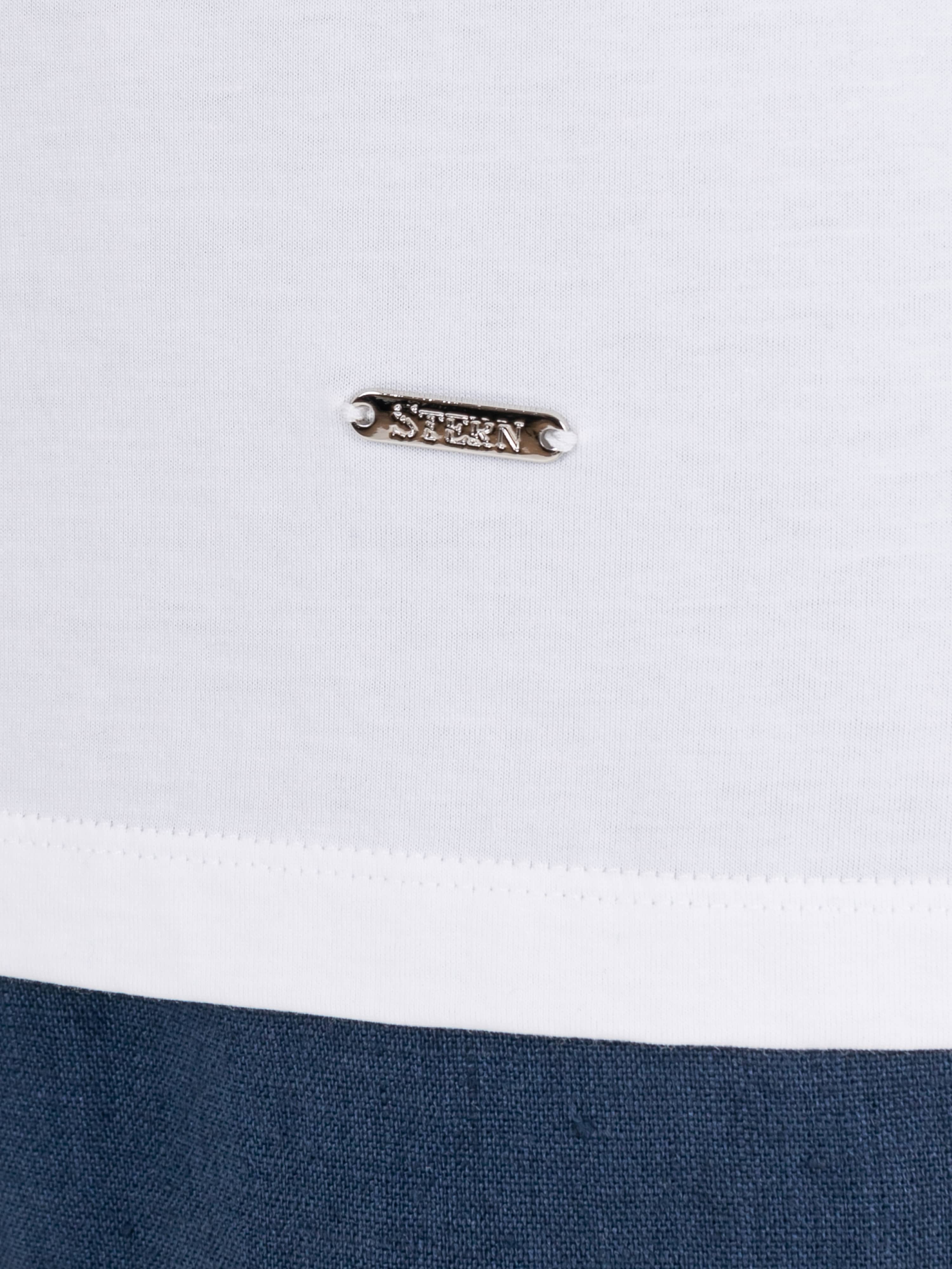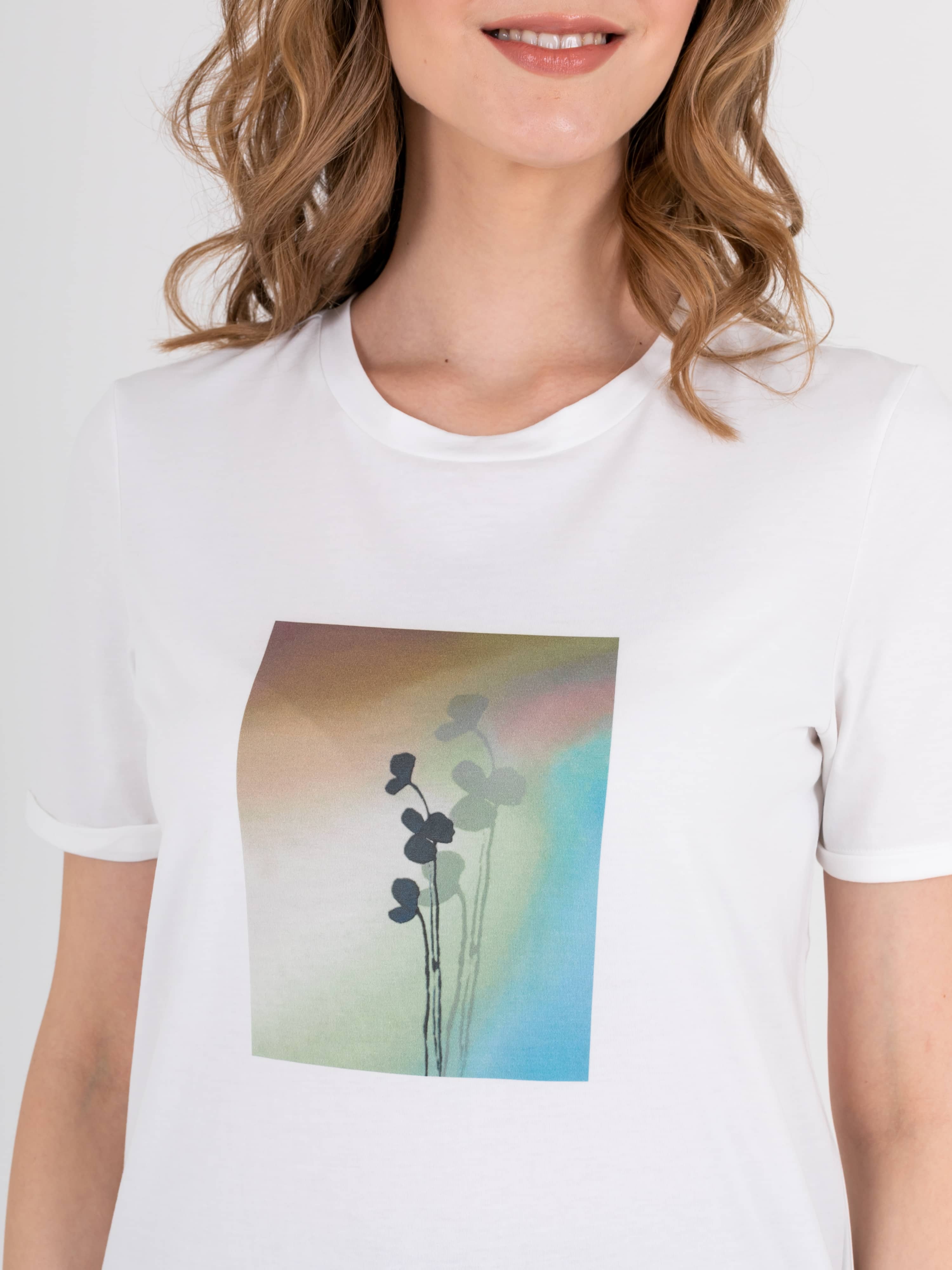 Футболка средней длины прямого силуэта из легкого 100% хлопка с разрезами в боковых швах. По переду выполнен нежный растительный принт. Укороченные втачные рукава. Круглый вырез горловины.