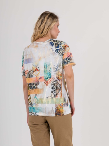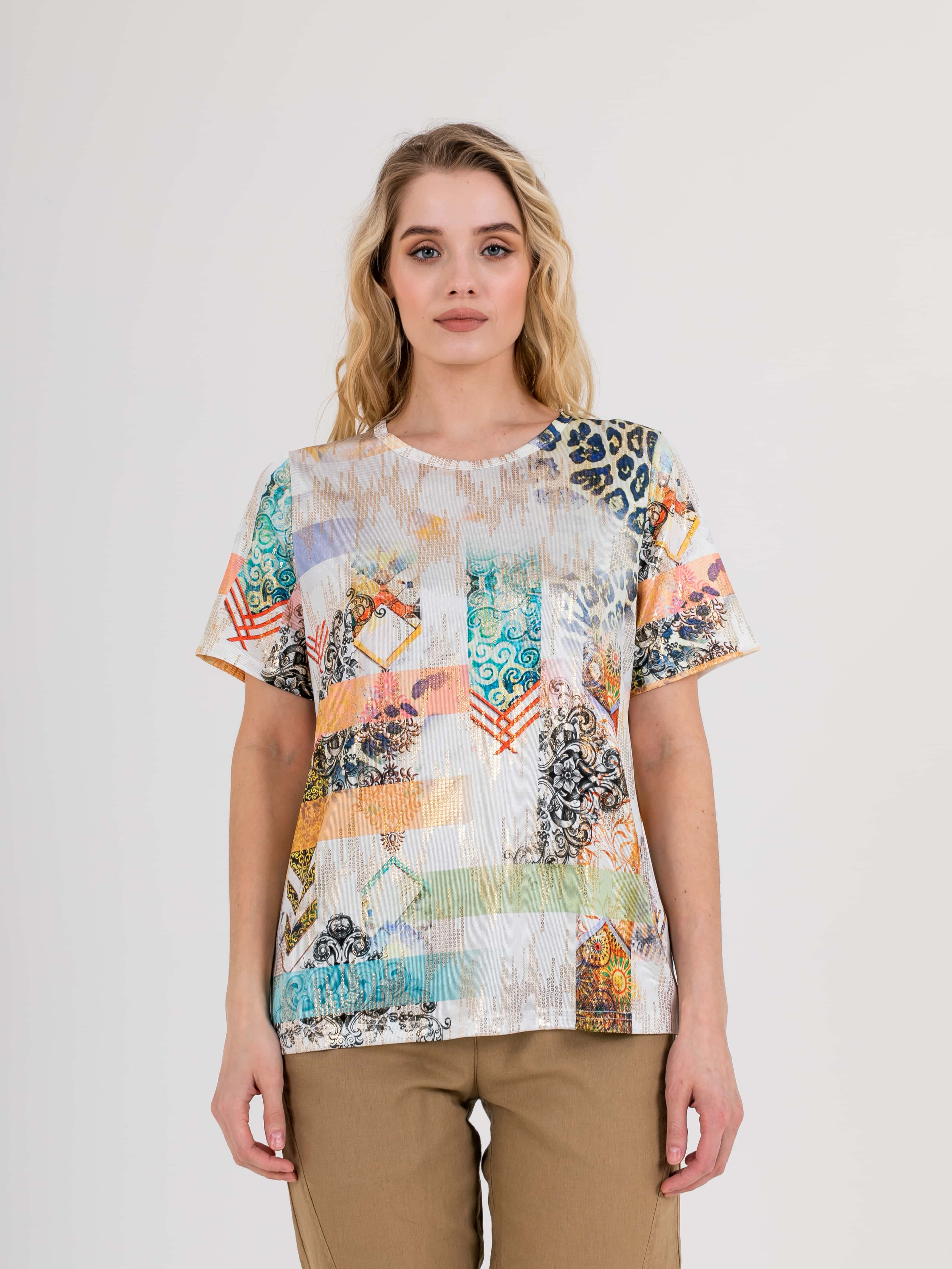 Футболка средней длины прямого силуэта из полиэстера с добавлением эластана, дизайнерская особенность модели – эффектный принт в восточном стиле с имитацией пайеток. Укороченные втачные рукава. Круглый вырез горловины.