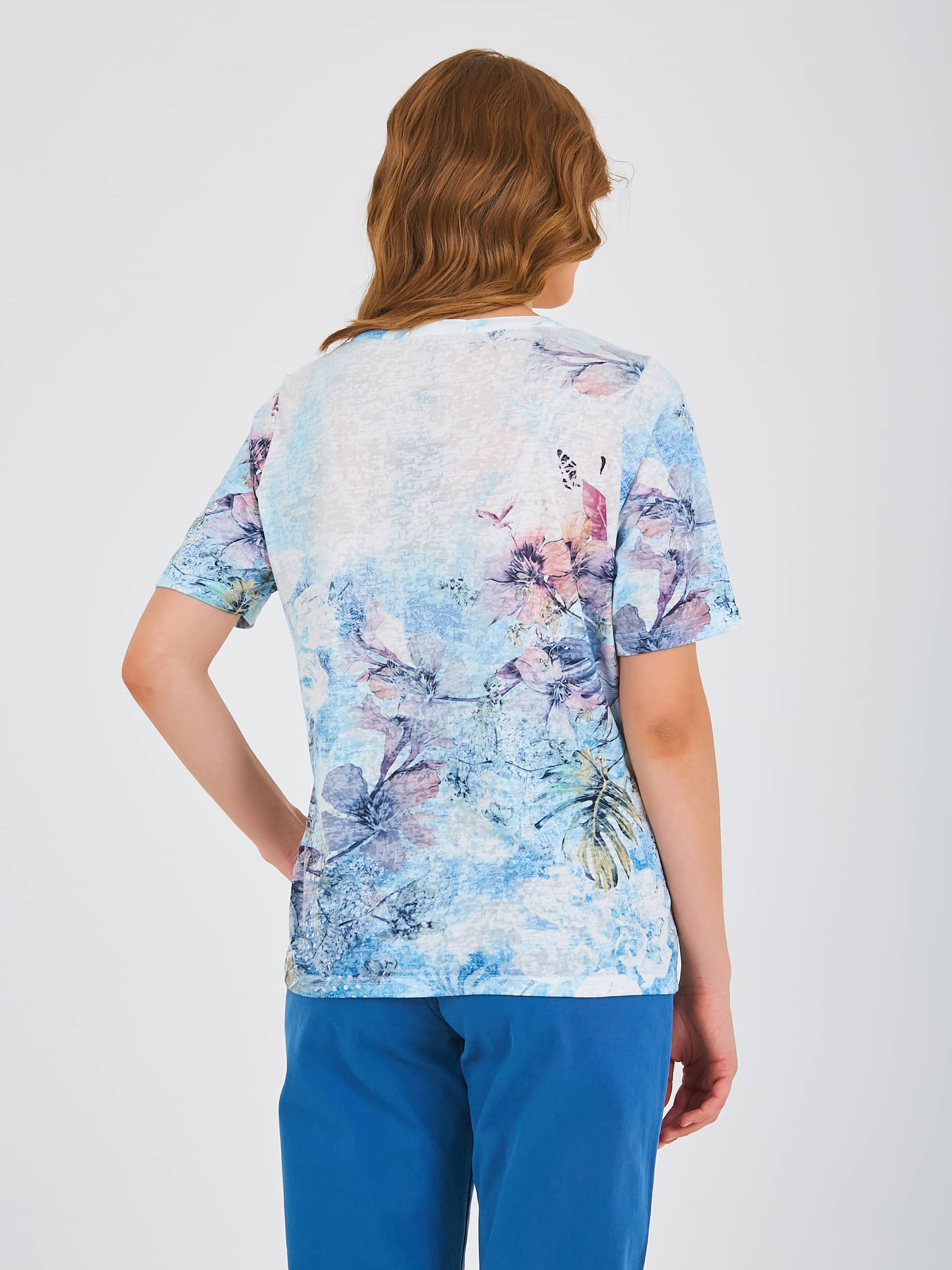 Футболка средней длины прямого силуэта из полиэстера с добавлением мягкой вискозы, дизайнерская особенность модели – тропический принт и фактурный трикотаж. Укороченные втачные рукава. Круглый вырез горловины с разрезом и планкой на три прорезные петли и пуговицы.