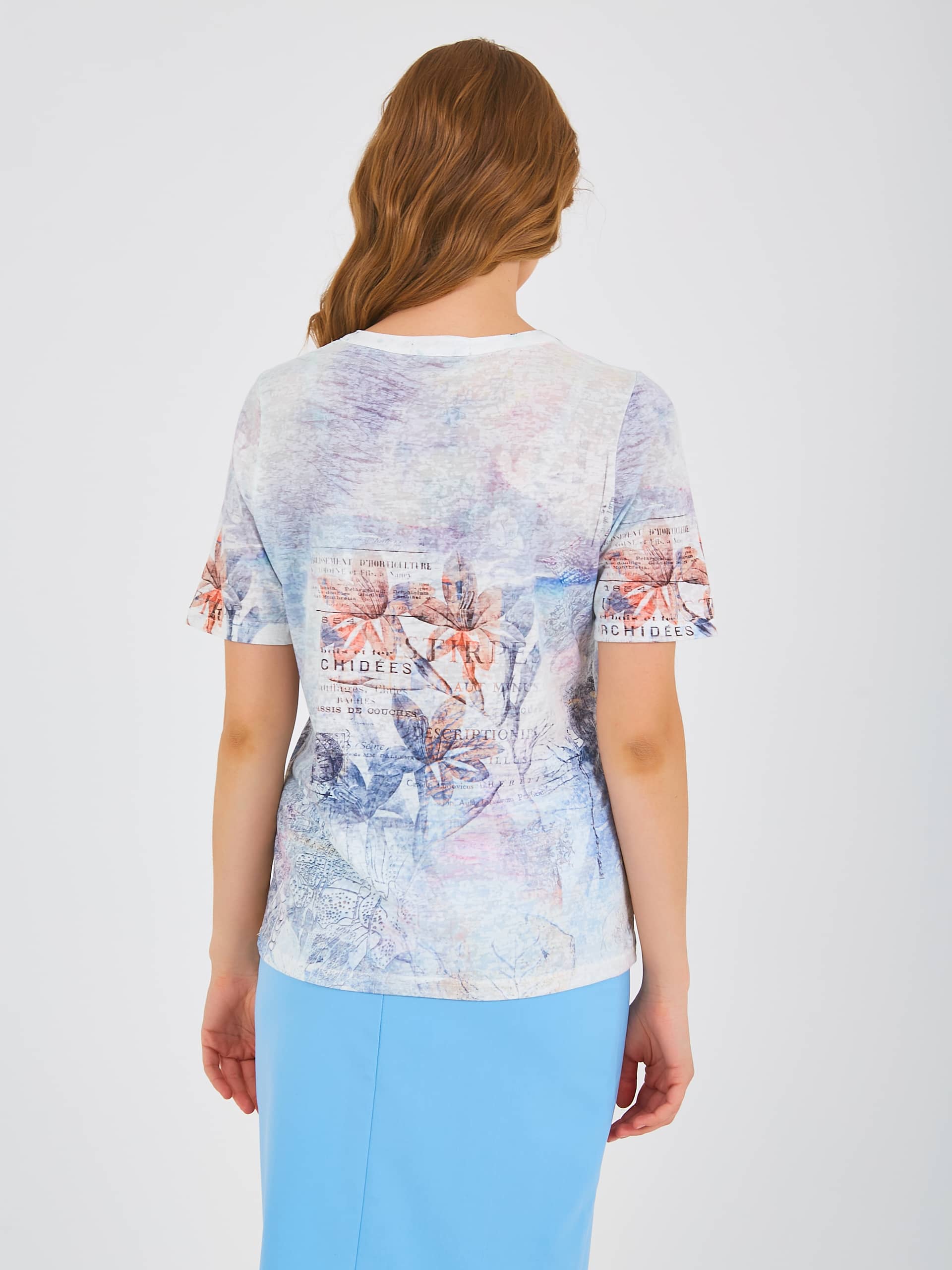 Футболка средней длины прямого силуэта из полиэстера с добавлением мягкой вискозы, дизайнерская особенность модели – нежный принт и фактурный трикотаж. Укороченные втачные рукава. Круглый вырез горловины с разрезом и планкой на три прорезные петли и пуговицы.
