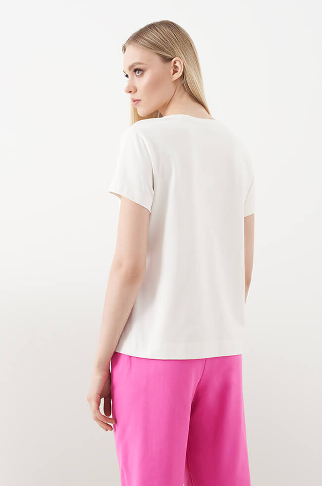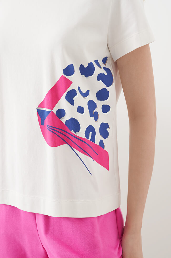 Футболка прямого силуэта, выполнена из трикотажного полотна. Овальный вырез горловины. Короткие притачные рукава. Спереди выполнен дизайнерский принт «Гепард» с фольгированным эффектом.