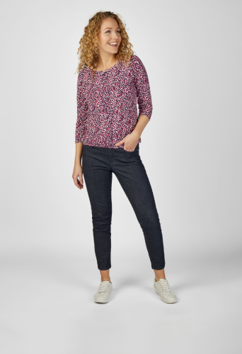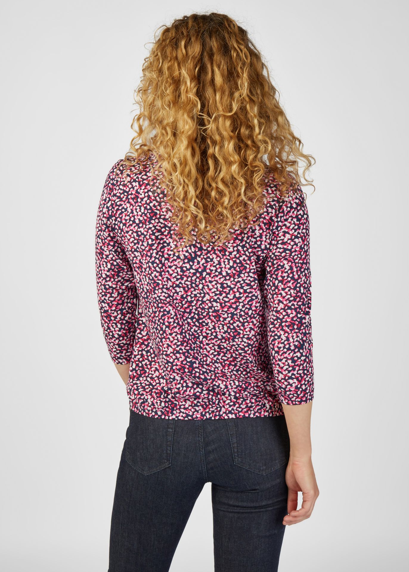 Современная футболка с минималистичным рисунком, которая придаст вашему образу элегантности! Футболка имеет классический круглый вырез с небольшим V-образным вырезом, который искусно подчеркивает дизайн. Рукава 3/4 обеспечивают комфорт и универсальность, а эластичный низ обеспечивает идеальную посадку. Эта футболка прямого кроя удобна и современна и станет незаменимым элементом вашего стильного гардероба.