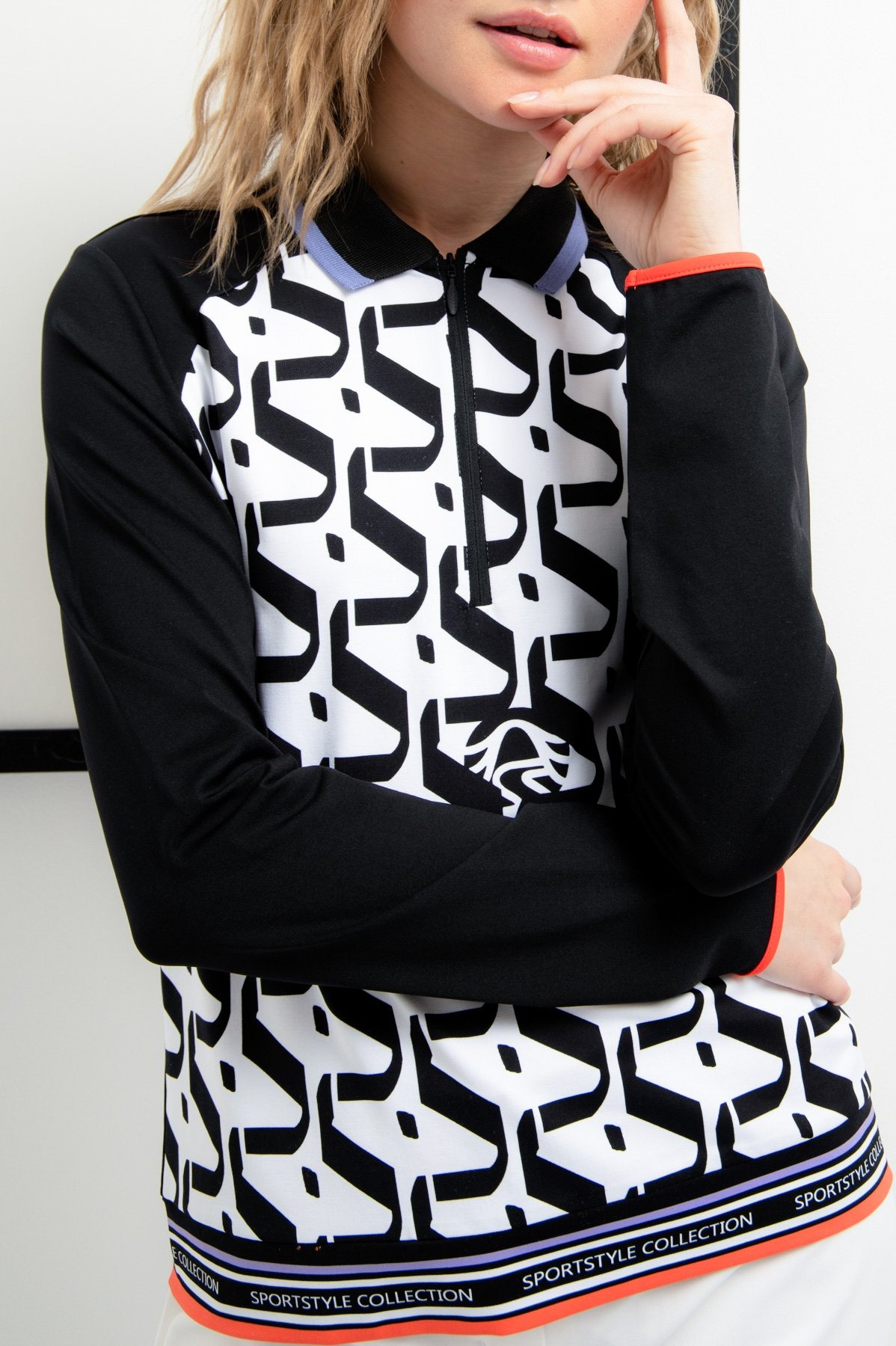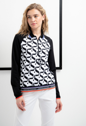 Повседневная рубашку-поло с длинными рукавами. Классический вязаный воротник имеет контрастную полоску по краю и заканчивается короткой молнией, гарантирующей комфортное одевание. Передняя часть с эксклюзивным графическим принтом со встроенными логотипами Sportalm привлекает всеобщее внимание. Рукава отделаны эластичной резинкой, а по низу имеется полосатая вышивка на манжете с надписью Sportalm. Классическую этикетку сзади заменяет принт из фольги.