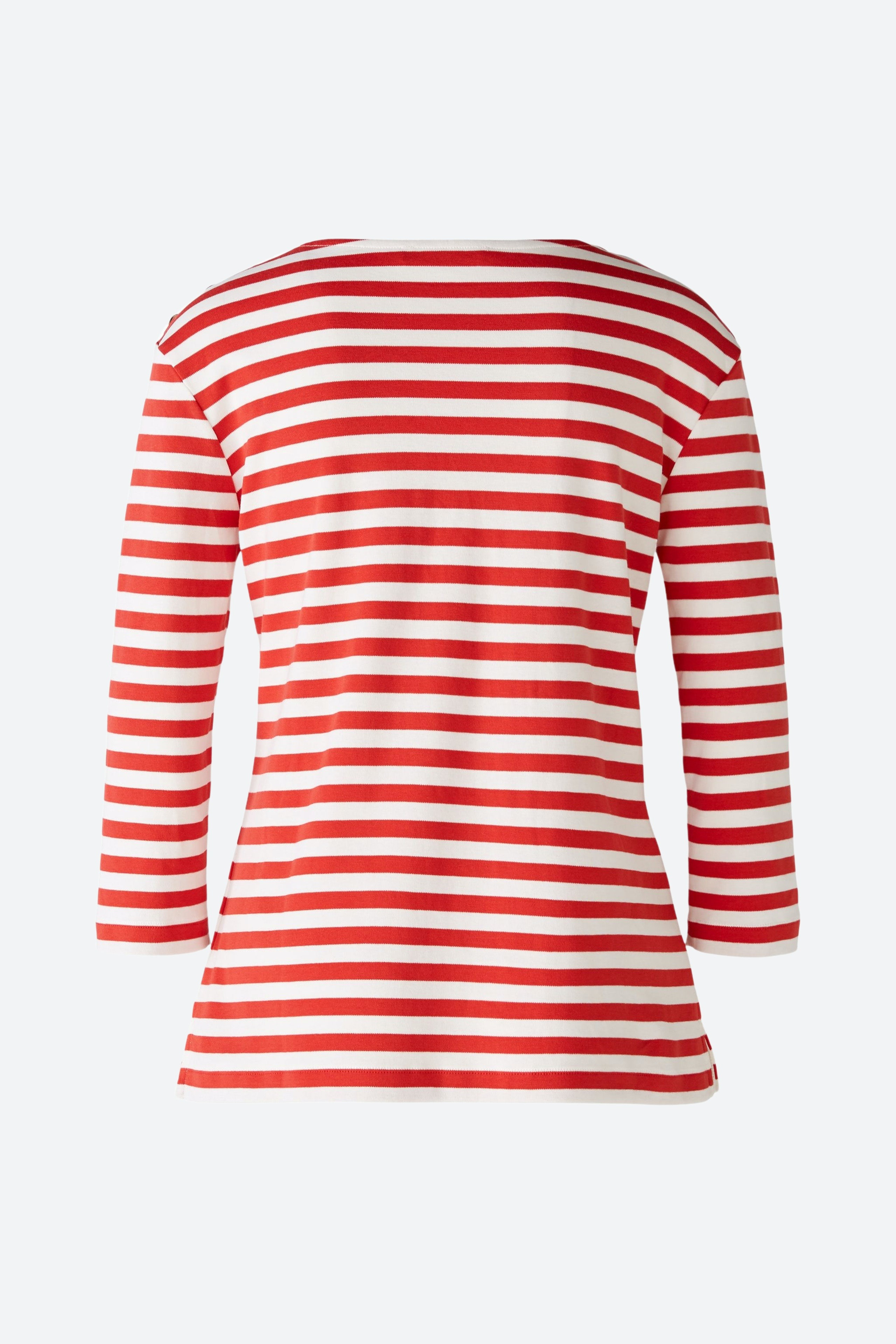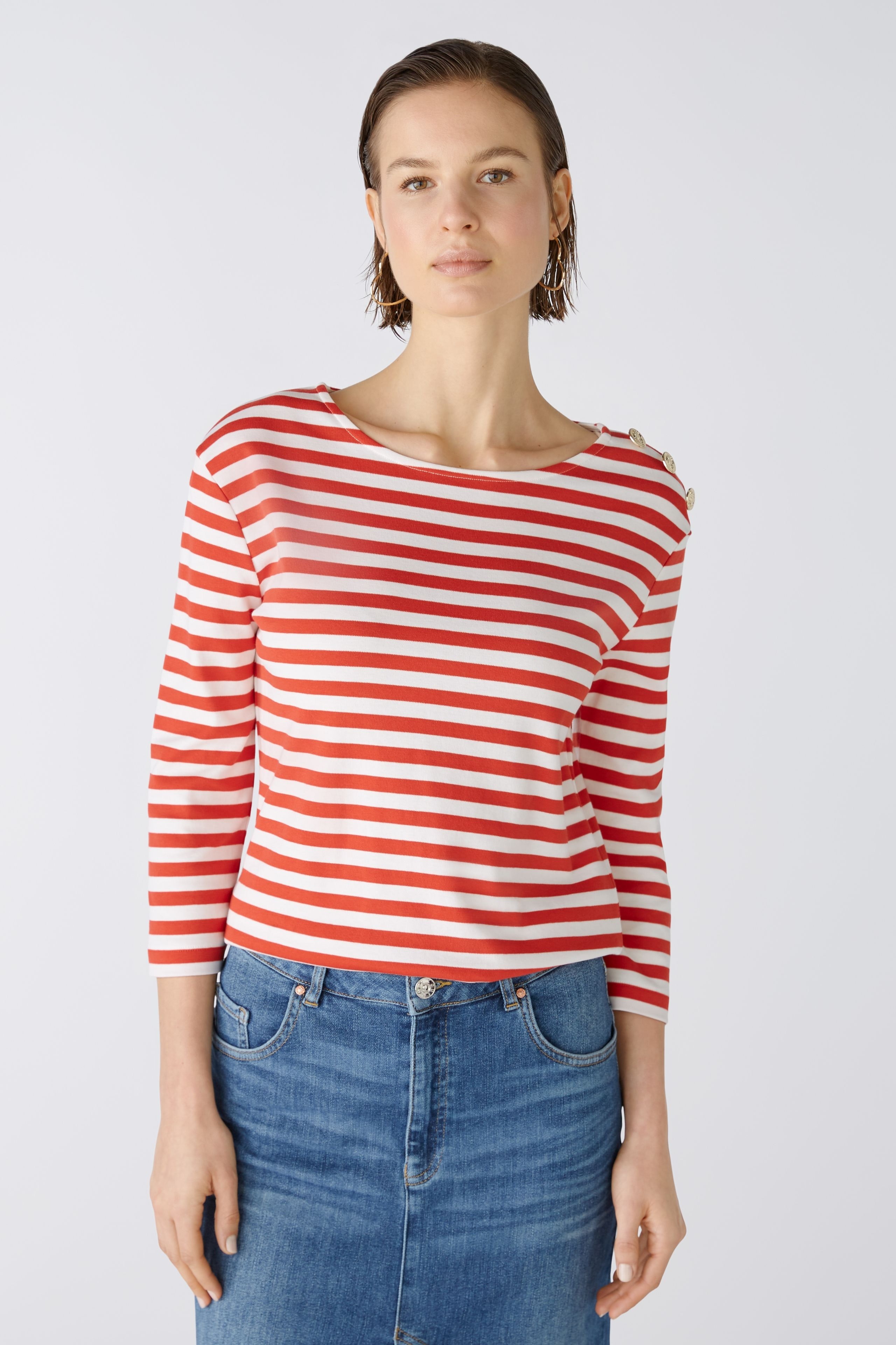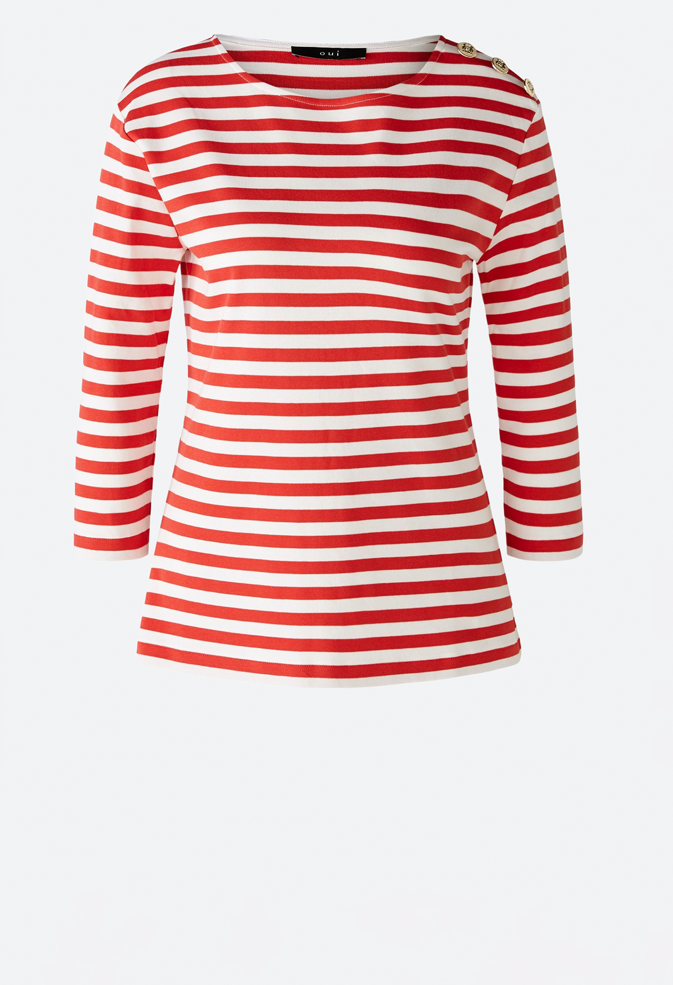 Мягкая, подчеркивающая фигуру футболка из 100% хлопка с декортиавными пуговицами на плече. Чистый, мягкий хлопок, связанный в полоску, без принтов. Прямой крой, стандартная длина. Женственный вырез «лодочка». Рукава длиной 3/4, на одном плече декоративные металлические пуговицы золотистого цвета. Небольшие разрезы по подол. Длина для размера 42: 64 см.