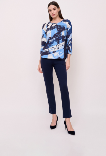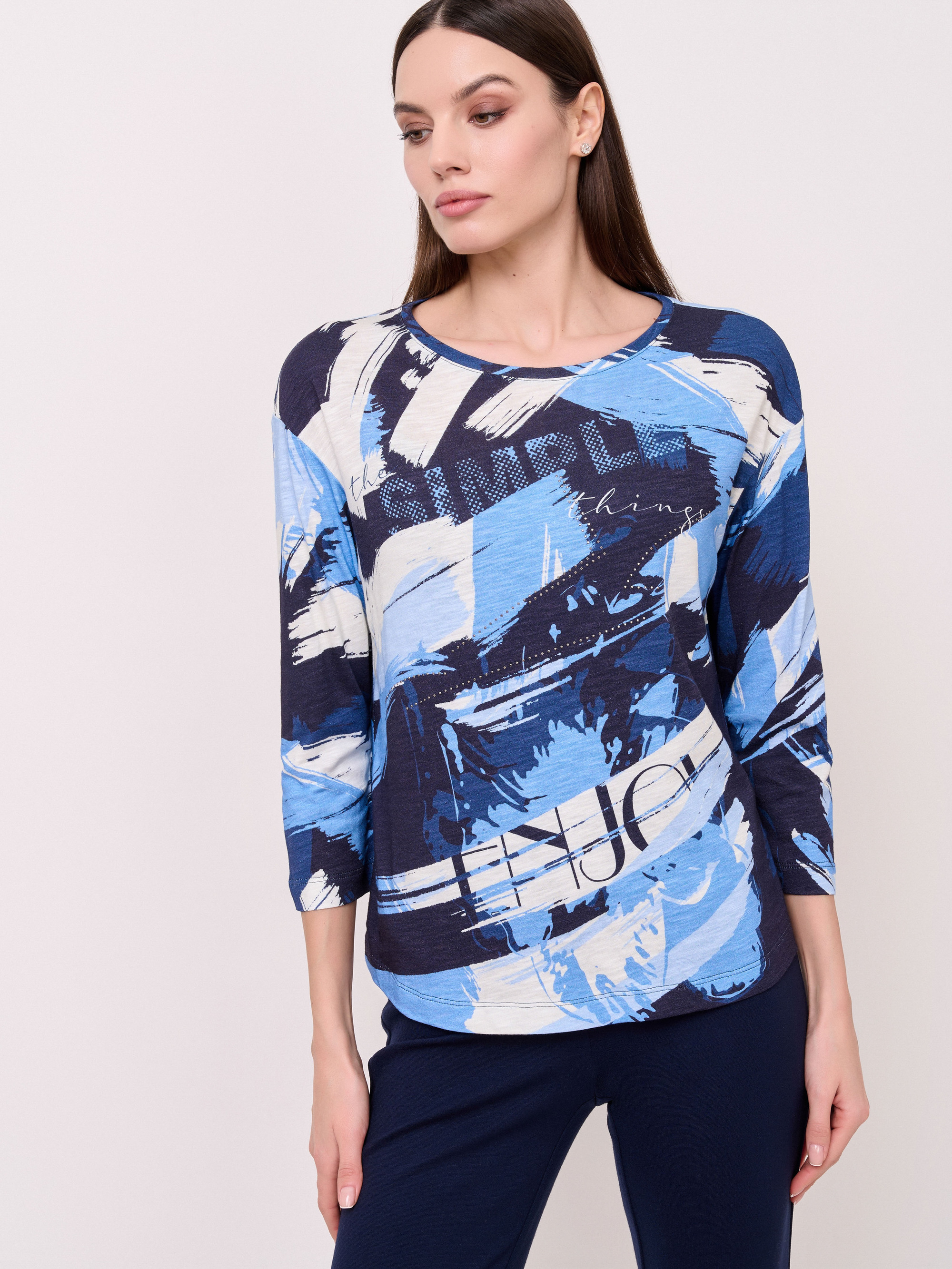 Детали: вырез горловины округлый, рукава 7/8, покрой прямой, рисунок абстракция, стразы. Длина по спинке: 58 см.