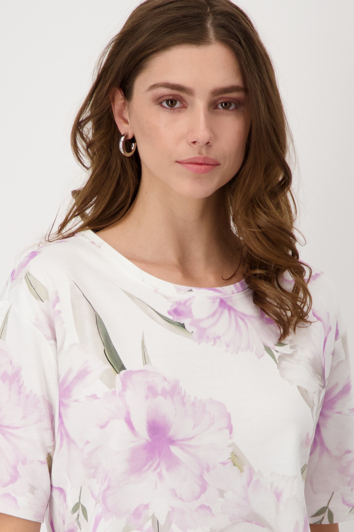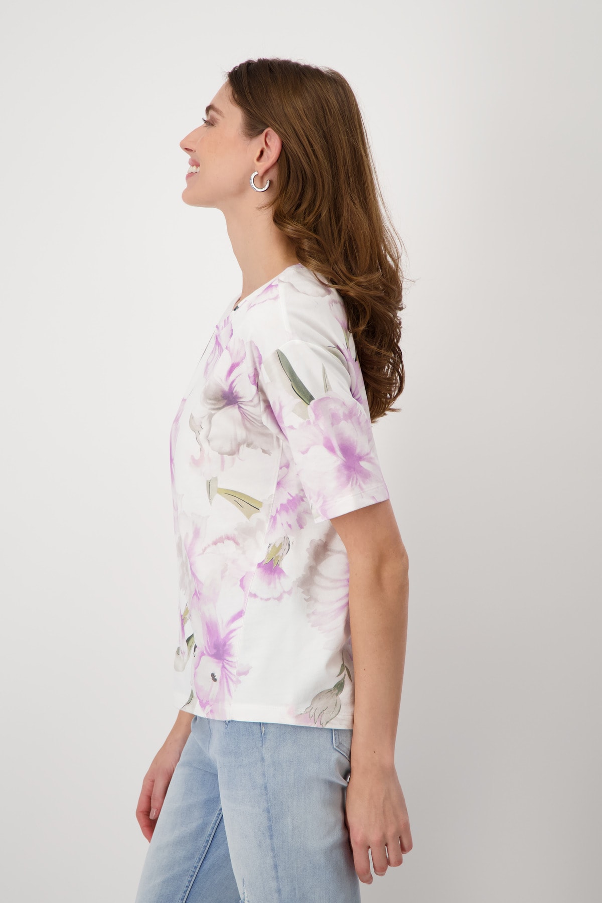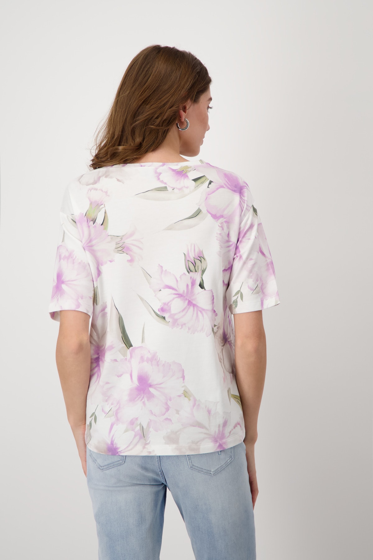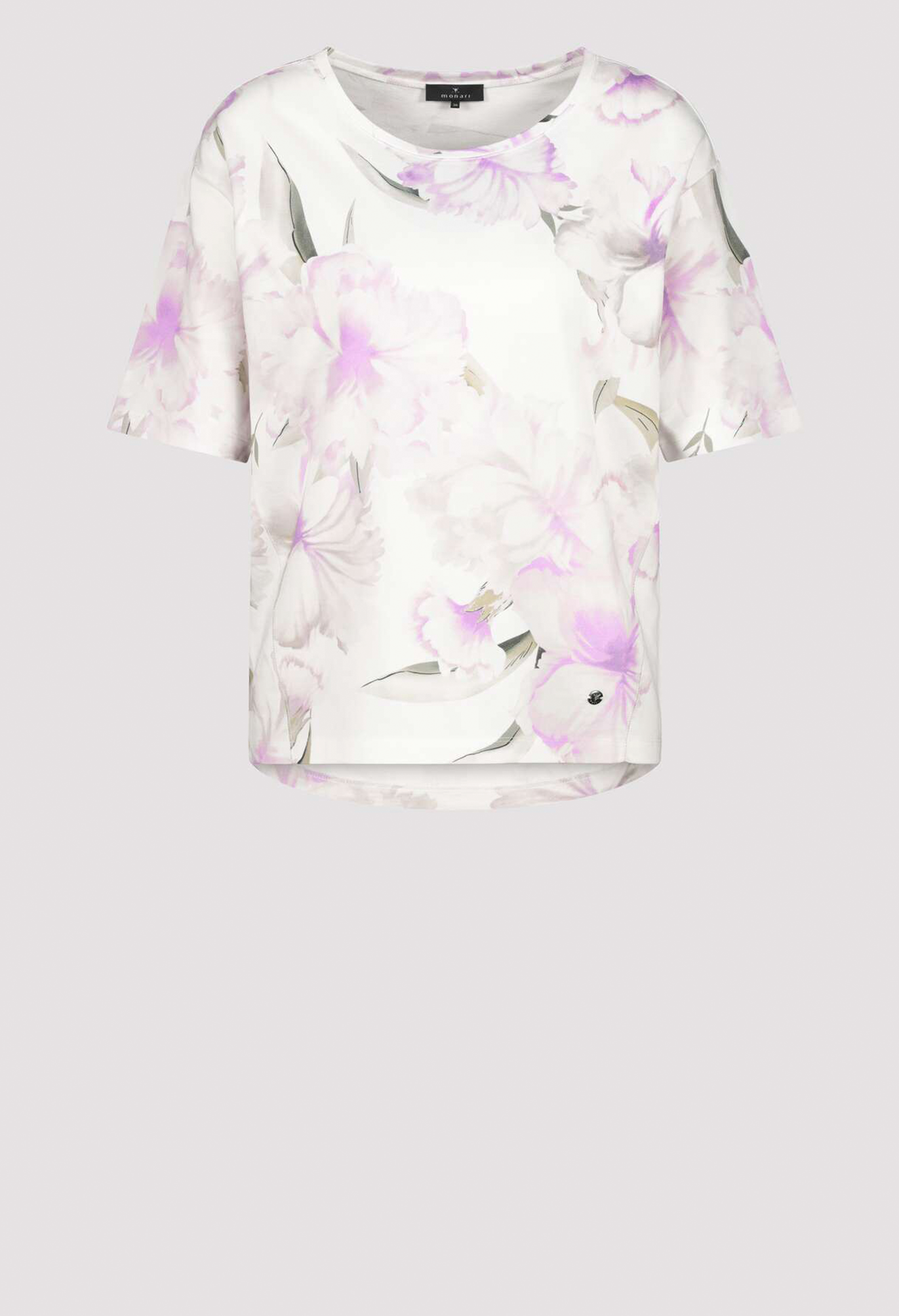 Футболка с нежным цветочным принтом по всей поверхности. Удивительно мягкая и удобная в носке. Высококачественная смесь хлопка. Регулярная посадка. Круглый вырез. Короткие рукава с вырезом. Удлиненная, закругленная спина. Длина спинки 44-го размера составляет 65 см, длина переда 62 см.