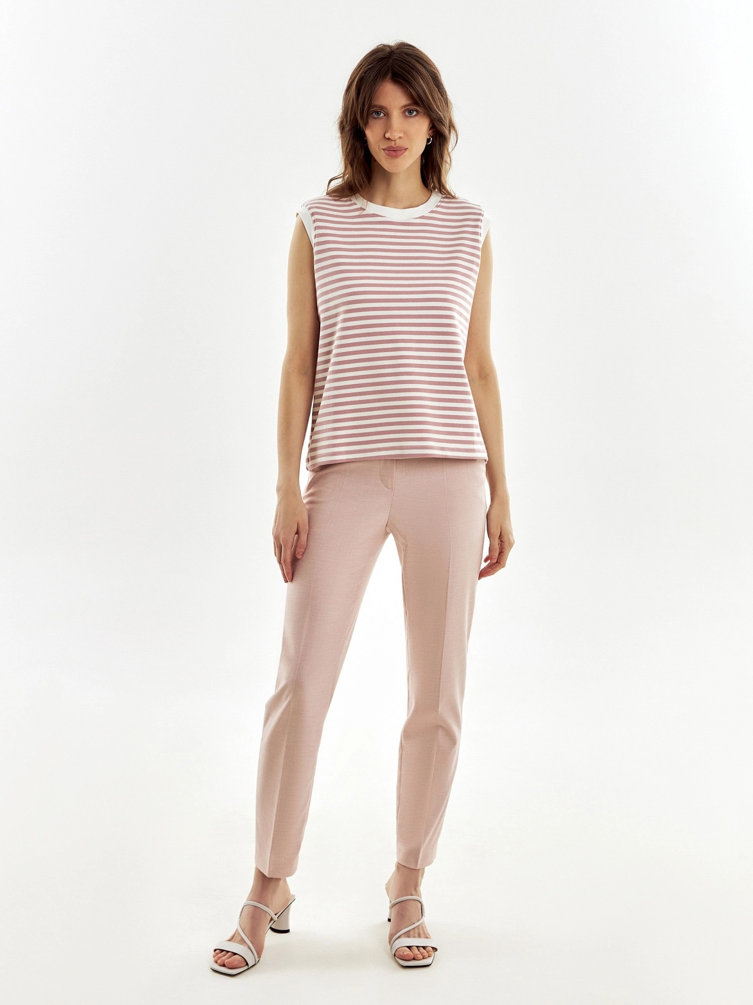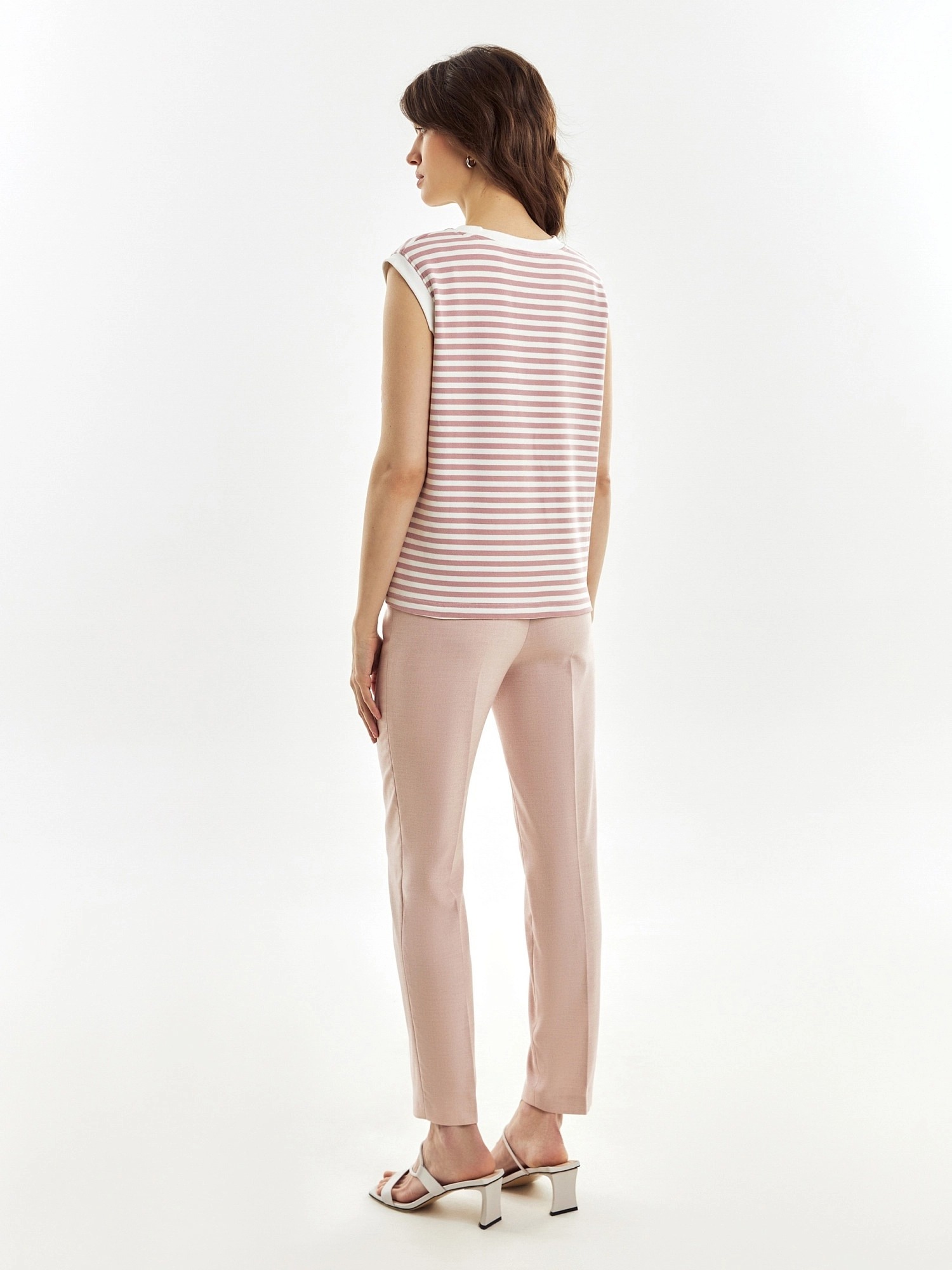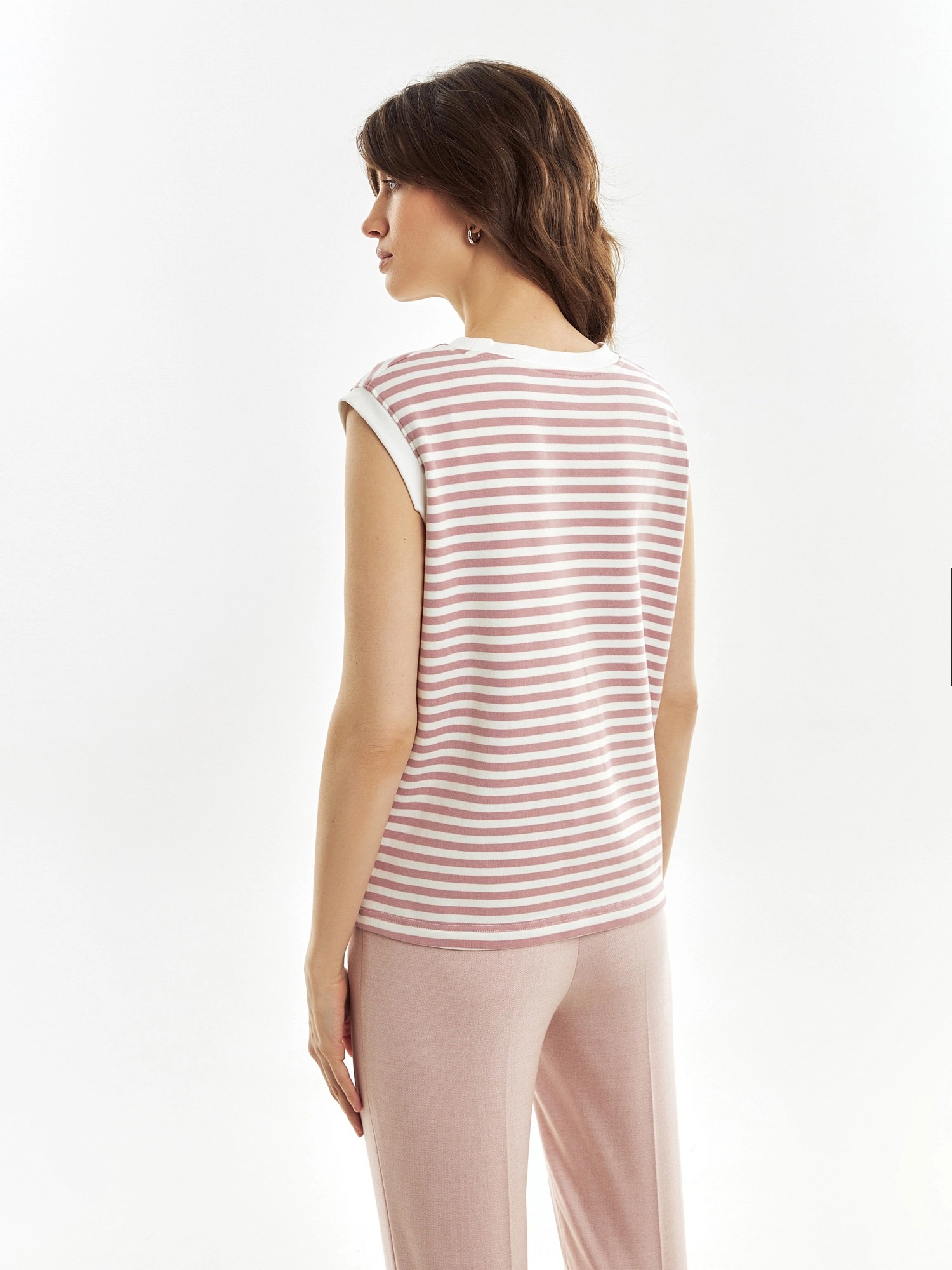 Топ из трикотажа в нежную розово-белую полоску, прямого силуэта, плечо расширено. Идеален для составления стильных кажуальных образов.