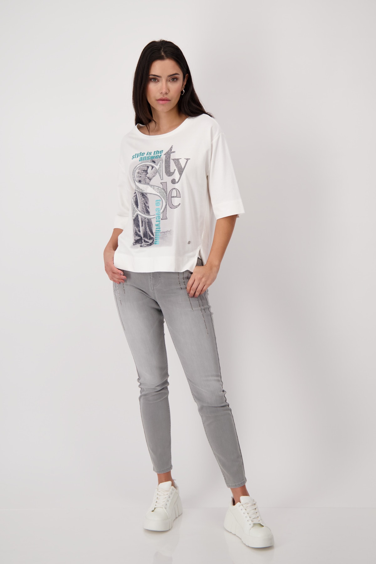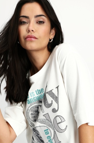Высококачественный хлопок. Мягкое ощущение. Фотопечать с надписью блестками. Буквы из горного хрусталя. Регулярная посадка. Круглый вырез. Короткие рукава слегка внахлест. Предварительный боковой шов с разрезами. Расширенная спинка. Длина 44-го размера по спинке — 66 см, длина по переду — 62 см.