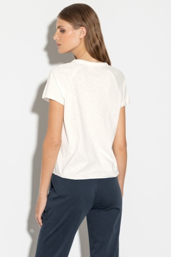 Футболка спортивного стиля повседневного силуэта с короткими рукавами реглан. Дизайн дополнен привлекательной надписью спереди и слегка закругленными краями.