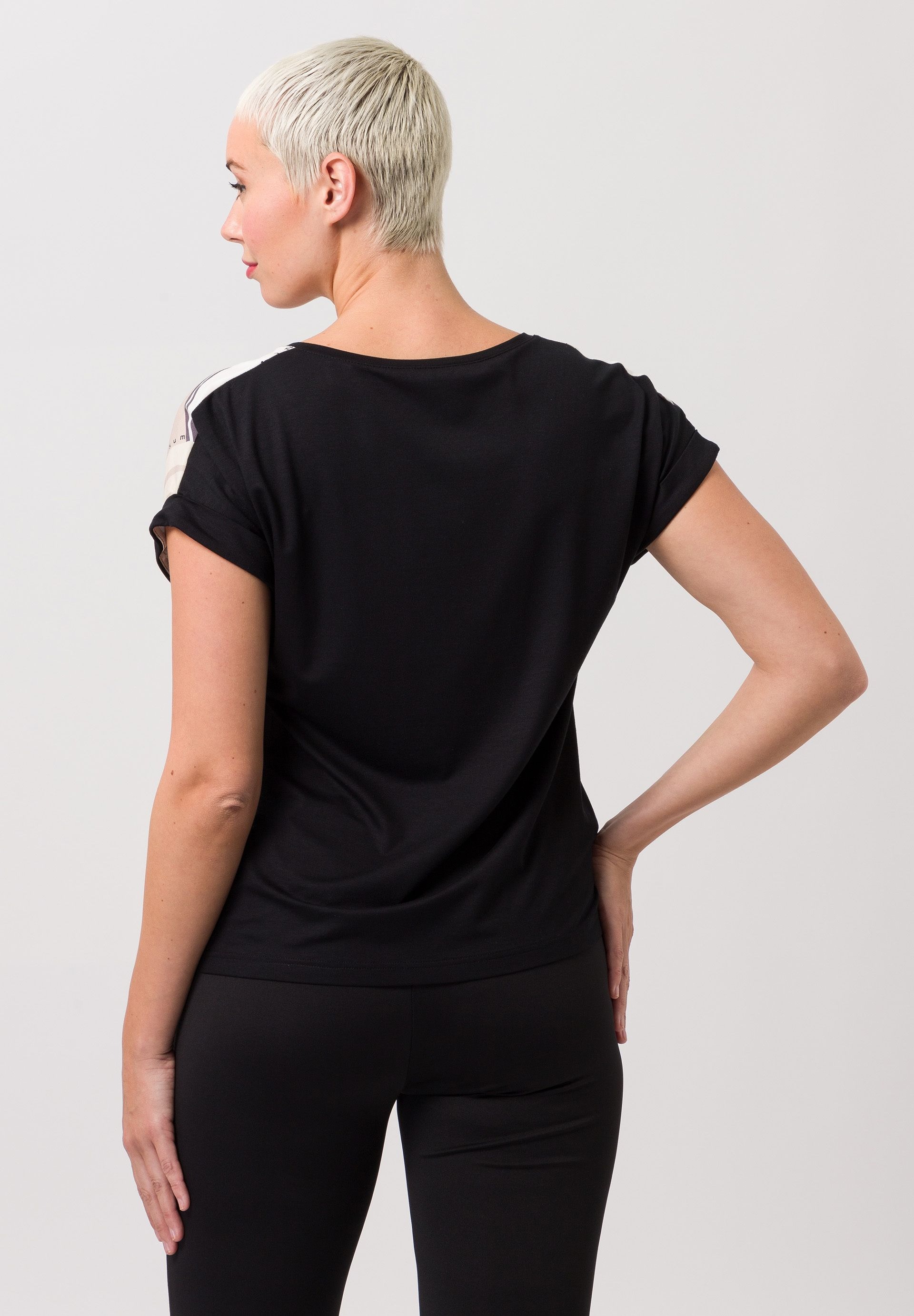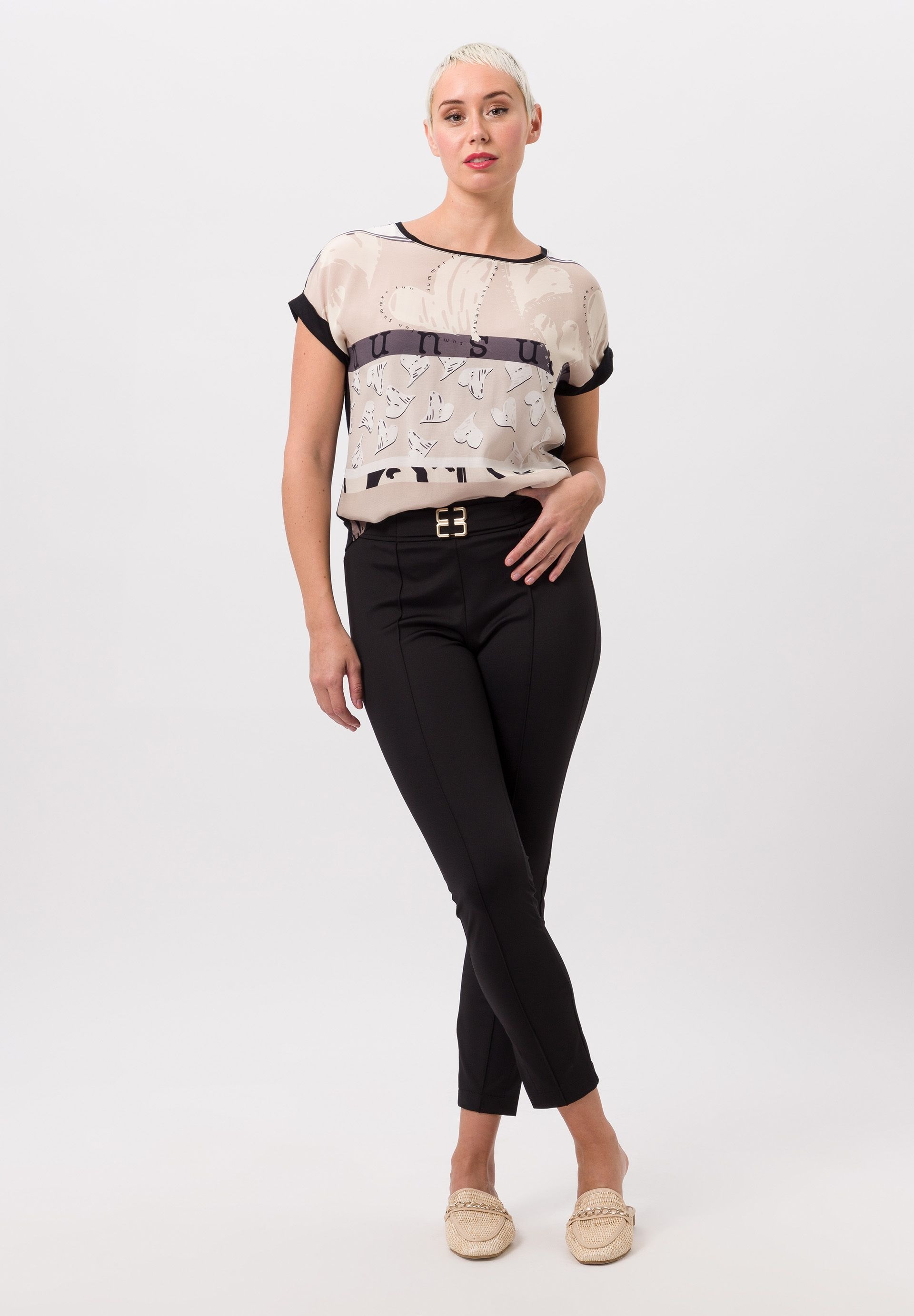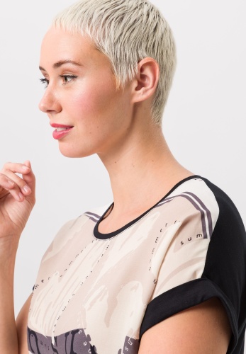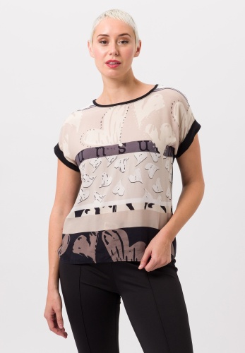 Футболка с принтом спереди. Элегантная ткань спереди и непринужденный джерси сзади. Передняя часть украшена привлекательным сочетанием узоров. Круглый вырез горловины и рукава кимоно выделяются благодаря однотонному краю. Длина в 42 размере - 60 см.
