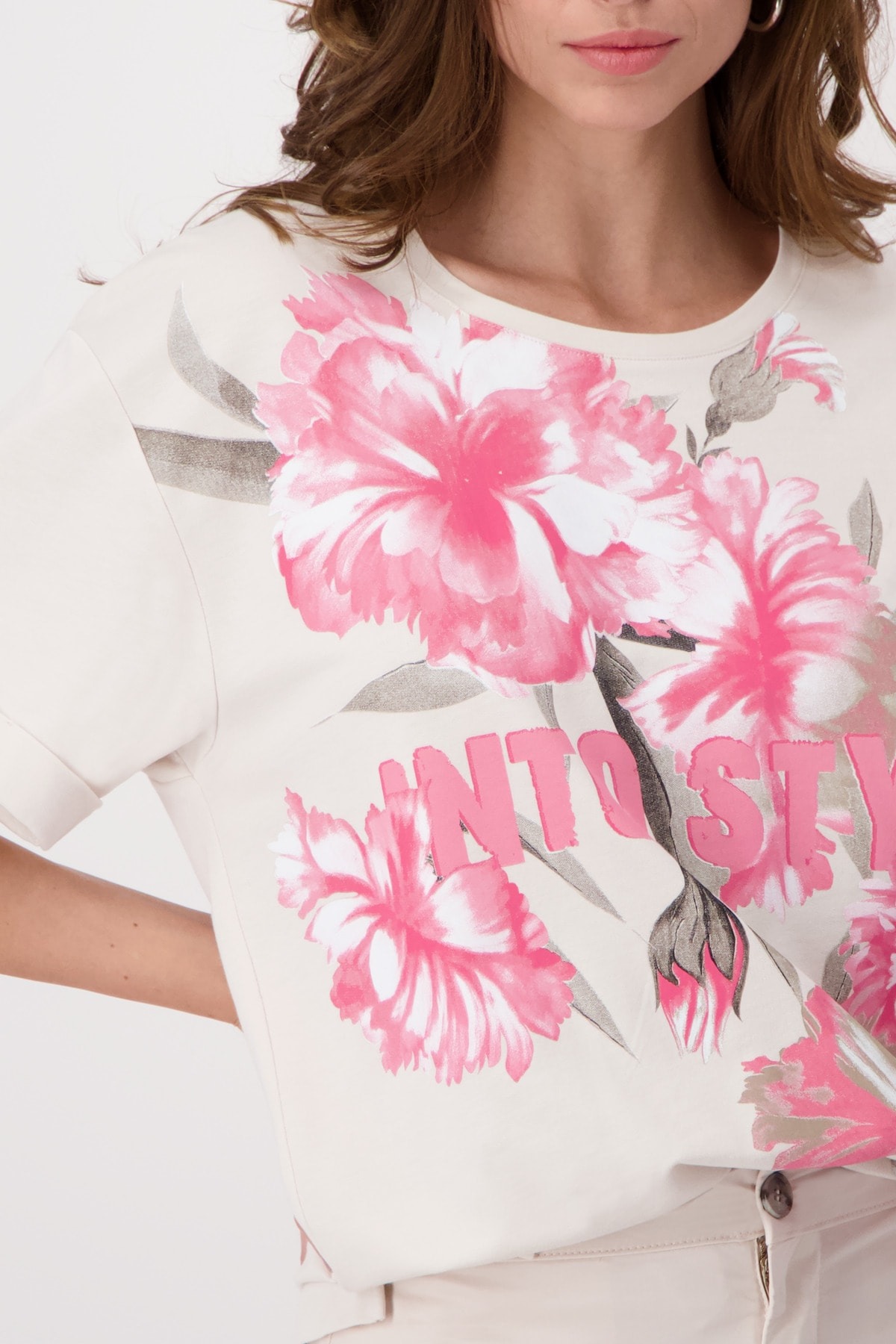 Футболка с короткими рукавами, письменным и цветочным принтом, повседневного кроя. Высококачественная смесь хлопка. Мягкое ощущение. Цветочный узор с надписью. Регулярная посадка. Круглый вырез. Манжеты. Боковые разрезы