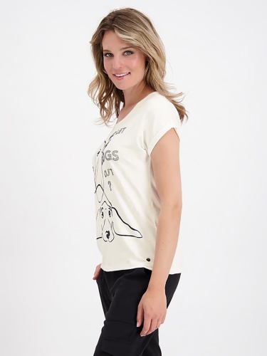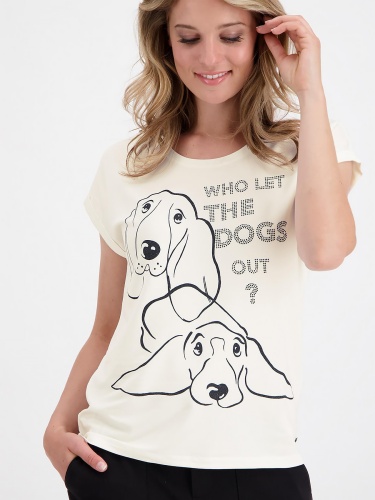 Футболка свободного кроя – практичная и удобная вещь на повседневность. Широкая овальная горловина, цельнокроеный короткий рукав с фиксированными манжетами. Принт на переде футболки украшают стразы. Материал приятен к телу и комфортен в носке.