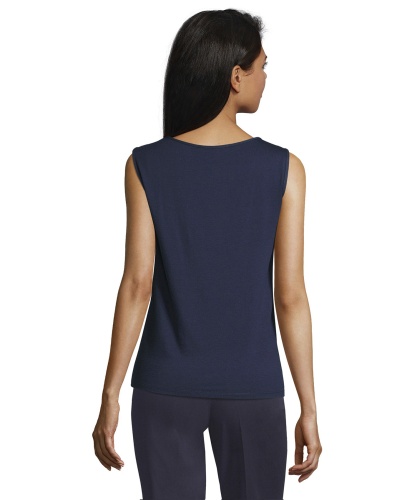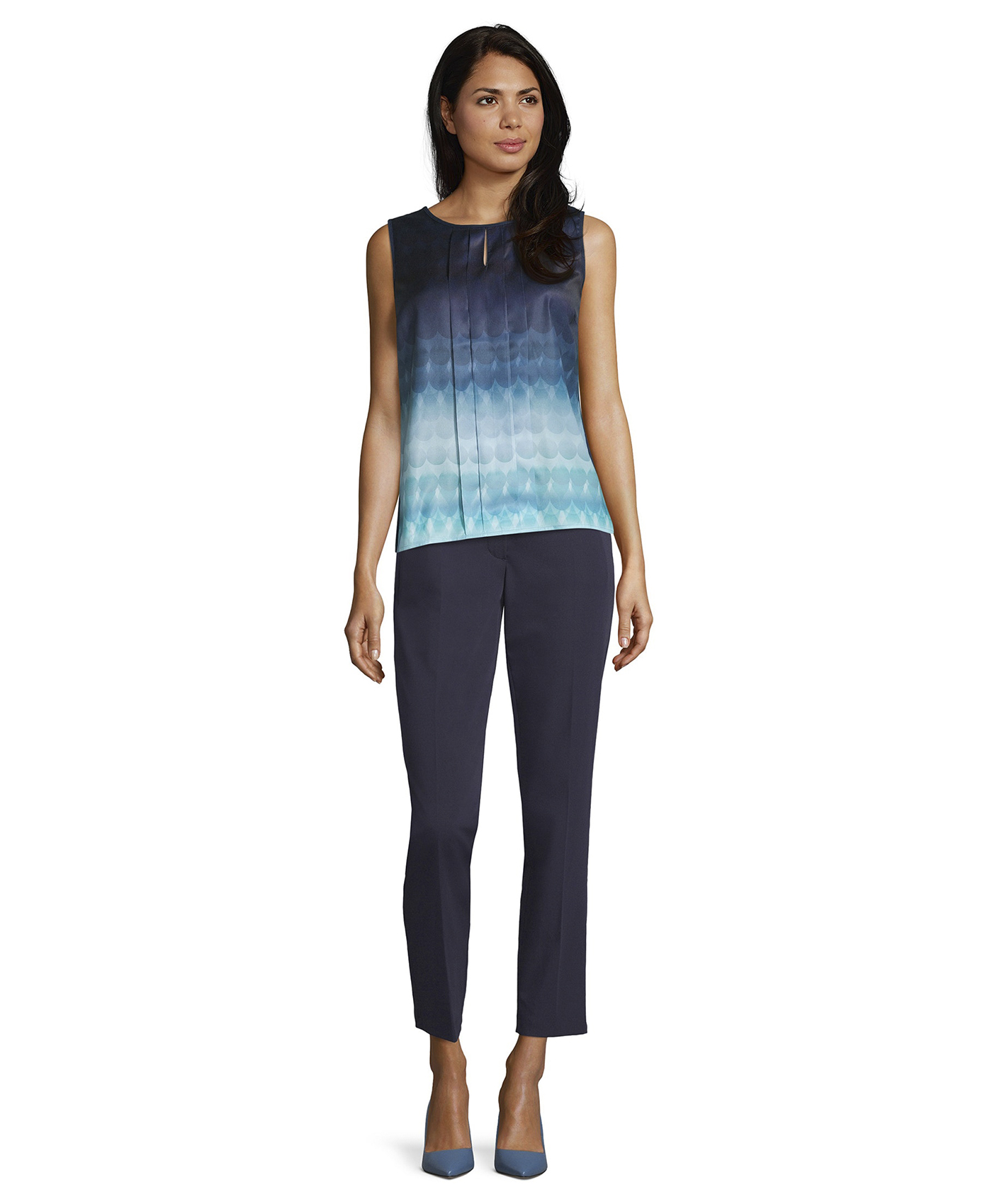В этом топе привлекает внимание абстрактный принт с эффектом градиент. Спинка изделия выполнена из однотонного темно-синего материала. Горловина "замочная скважина". Приятный к телу материал из вискозной смеси. Данная модель отлично смотрится как с брюками, так и с юбкой-карандашом.