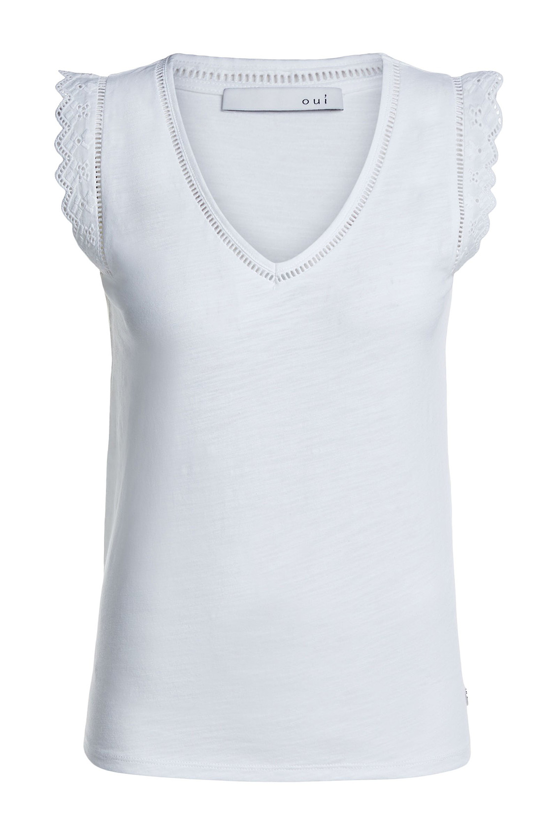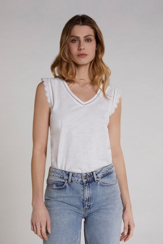Белоснежный топ - простая, но совсем не скучная модель! Прямой покрой, V-образный вырез горловины. Обилие ажурных элементов создает романтический образ. Хлопковый материал приятен к телу и обеспечивает комфорт. Этот топ - прекрасный вариант верха в любом модном ансамбле.