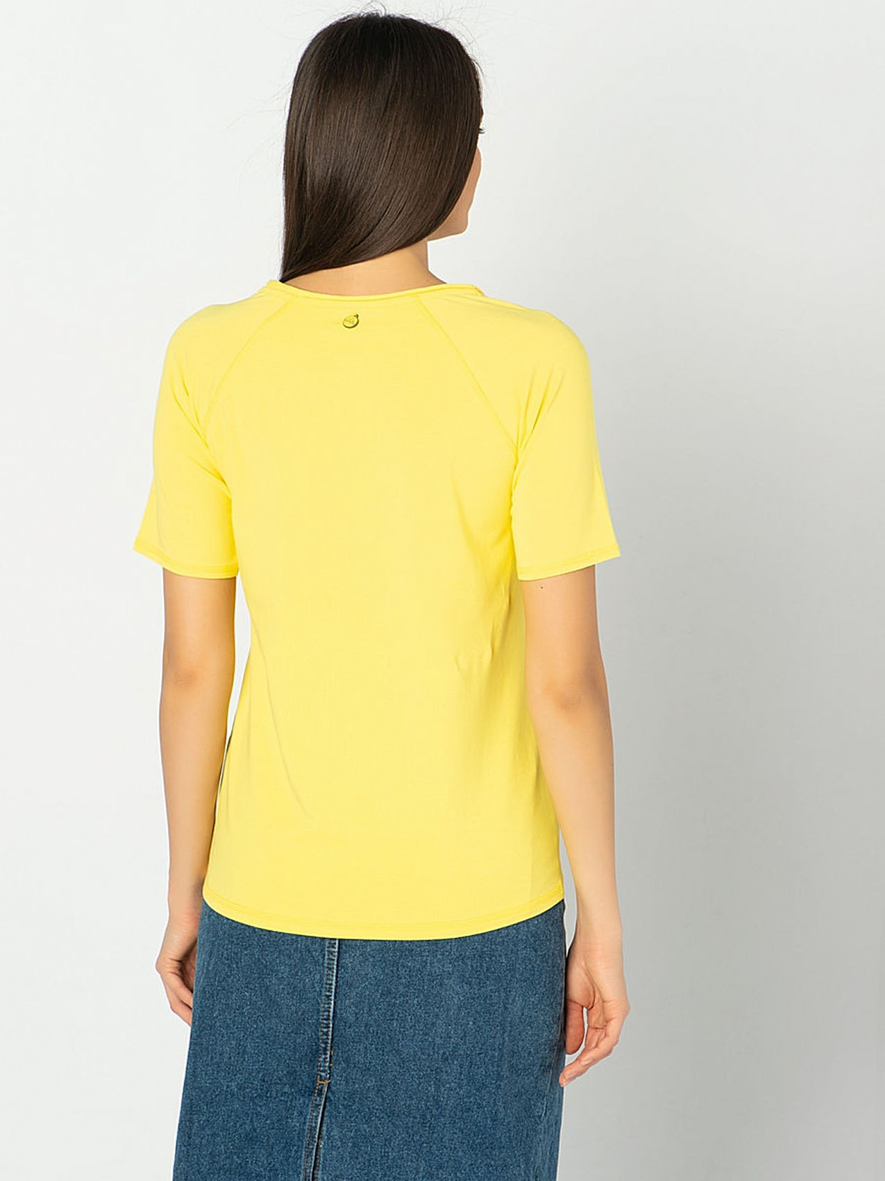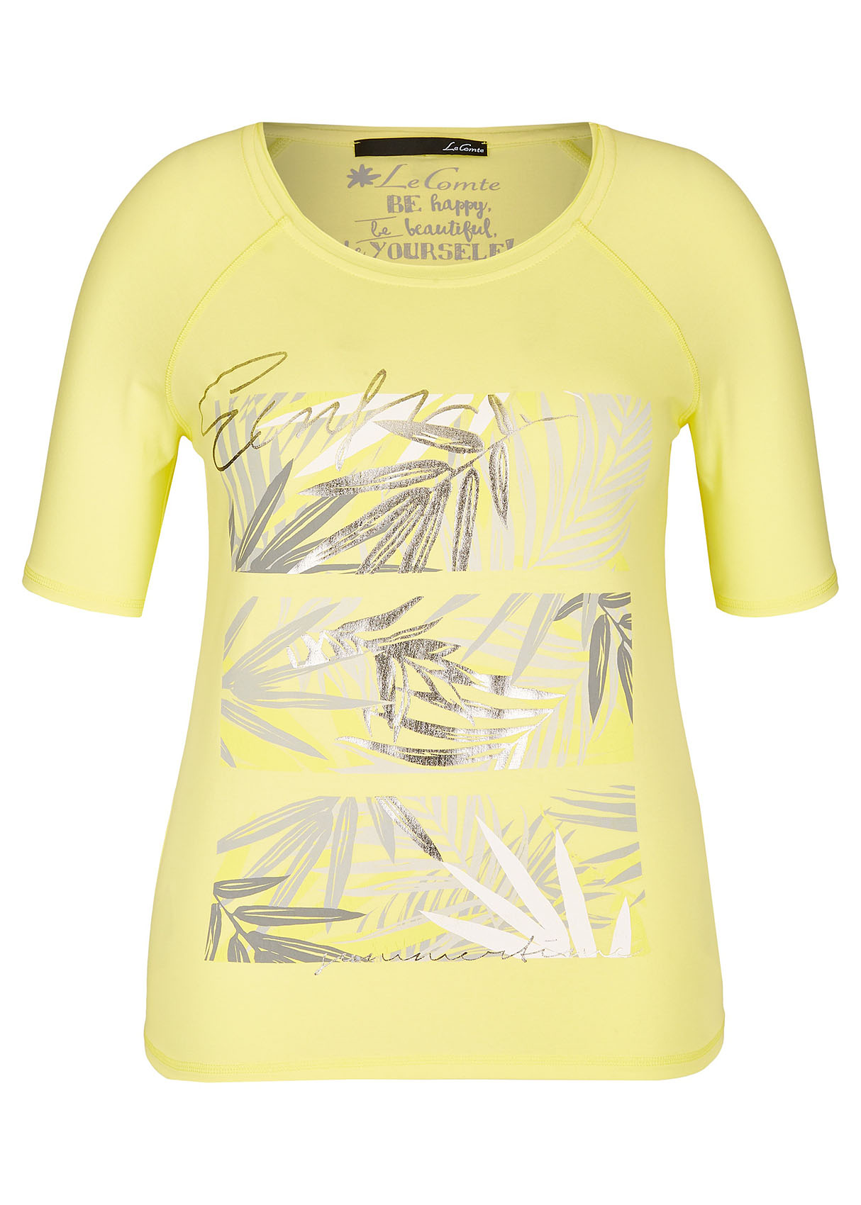 Яркая футболка - залог солнечного настроения! Трендовый принт с тропическими мотивами подчеркнет вкус обладательницы футболки. Вырез "лодочка", рукава реглан. Приятный к телу материал из смеси хлопка и эластана.