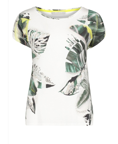 Футболка прямого покроя. Широкий круглый вырез горловины, короткие цельнокроеные рукава. Принт с надписью и трендовыми тропическими мотивами. Спинка изделия выполнена из материала с принтом в полоску. Приятный к телу материал из вискозной смеси. В сочетании как с брюками, так и с юбкой эта футболка создает стильный современный образ.