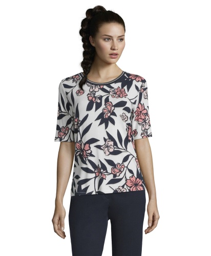 Цветочный принт - непреходящий тренд! Прямой покрой, круглый вырез горловины, рукава 1/2. Вискозная смесь приятна к телу и обеспечивает комфорт. Эта футболка идеально сочетается с любым однотонным низом и обувью.
