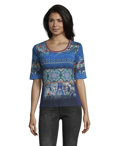 Футболка приталенного силуэта подчеркивает достоинства фигуры. Круглый вырез горловины, рукава 1/2. Материал из хлопковой смеси обеспечивает комфорт. Этнический принт и красивое сочетание контрастных цветов непременно обратят на себя внимание. Эта яркая вещь освежит любой комплект одежды!