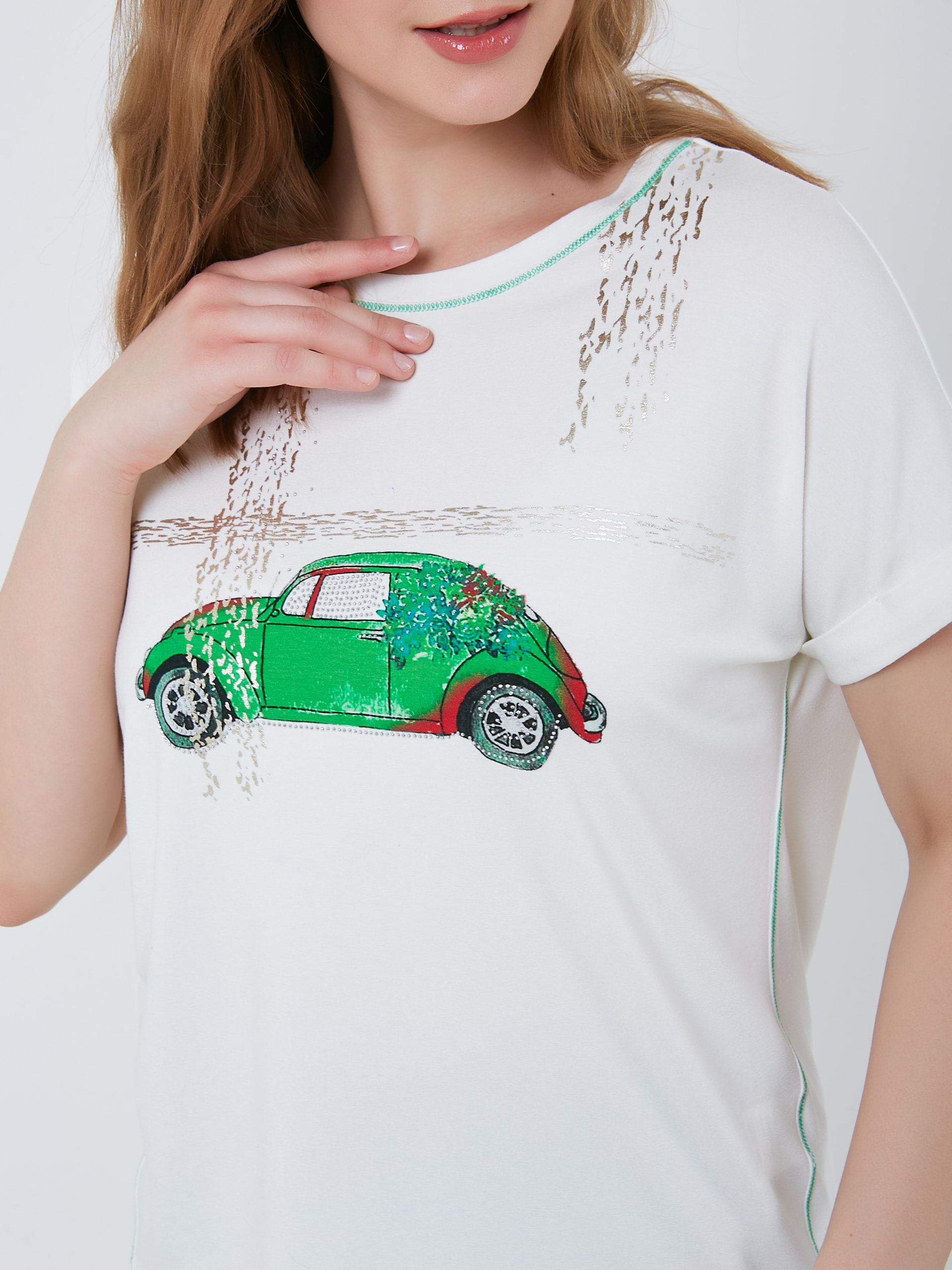 Футболка с изображением автомобиля с растительными мотивами и контрастной зеленой строчкой по бокам и на горловине. Весна-Лето 2025. Капсула "Марракеш". Параметры модели: 95-64-101, рост 175, размер 44-46