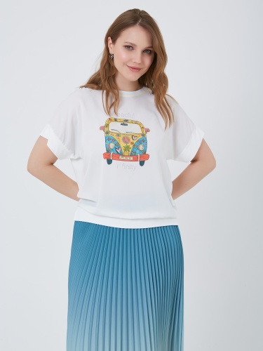 Базовая модель футболки с принтом цветочного авто с буквой S и выточками по бокам. Весна-Лето 2025. Капсула "Санторини". Параметры модели: 95-64-101, рост 175, размер 44-46