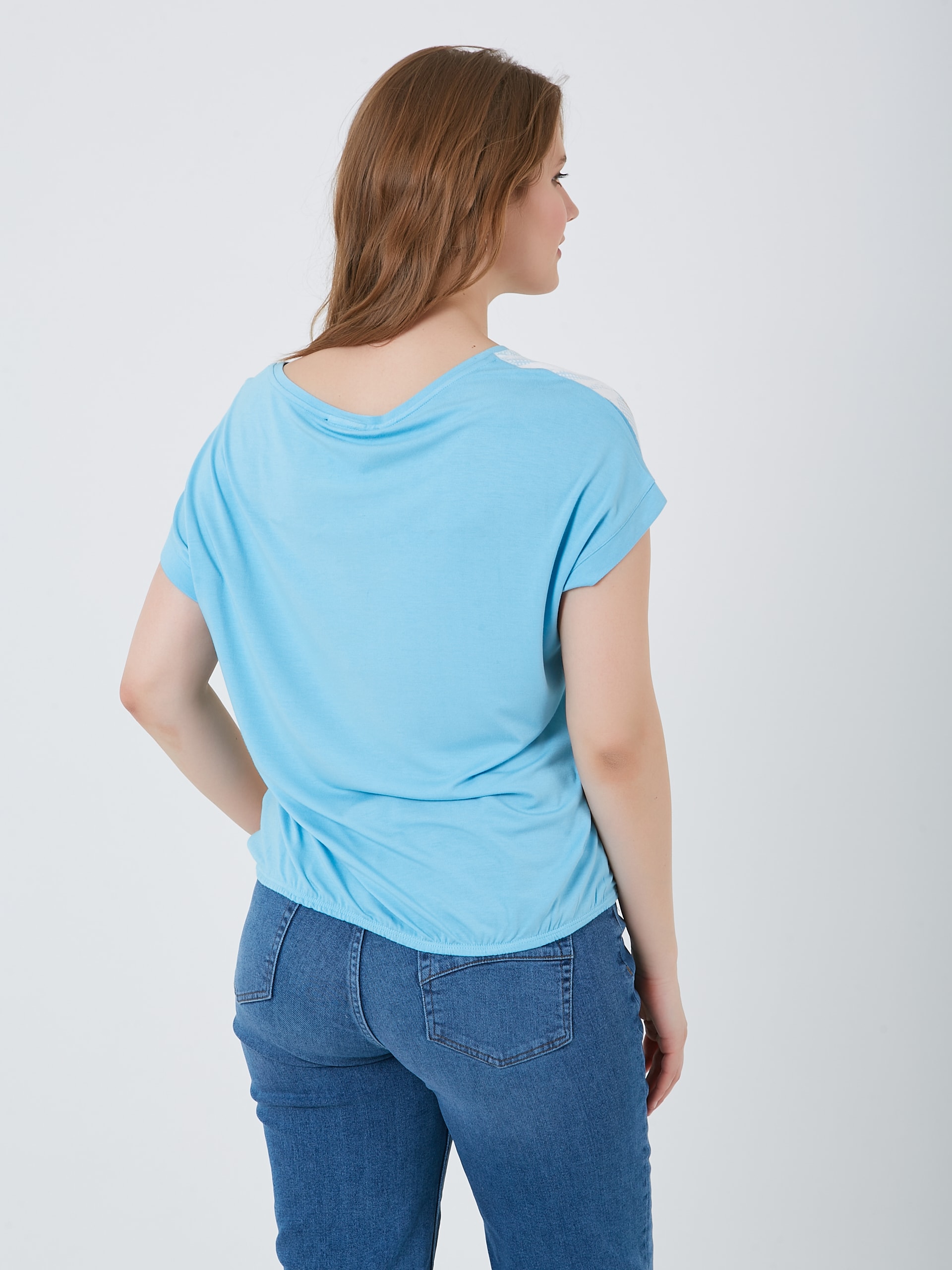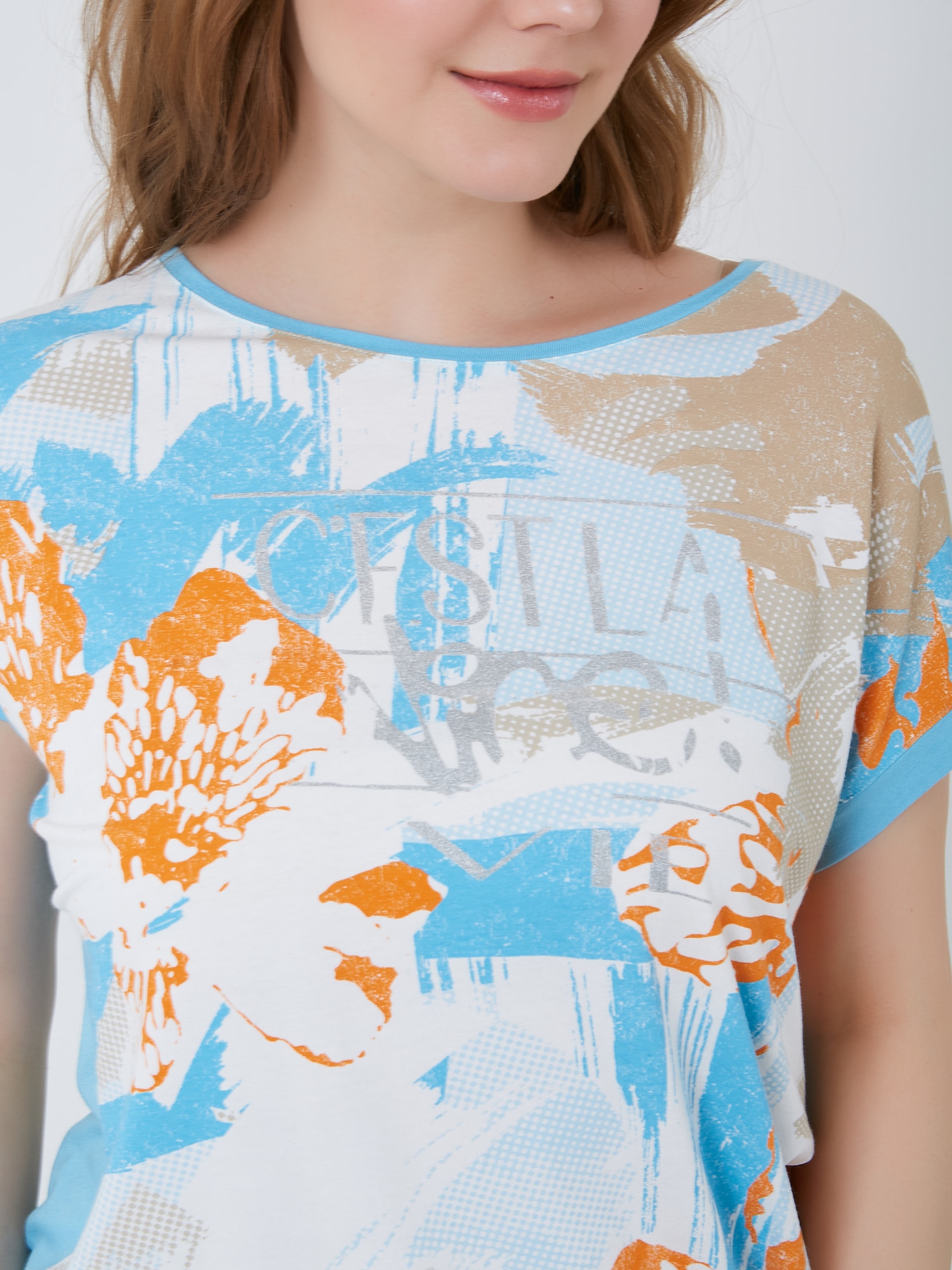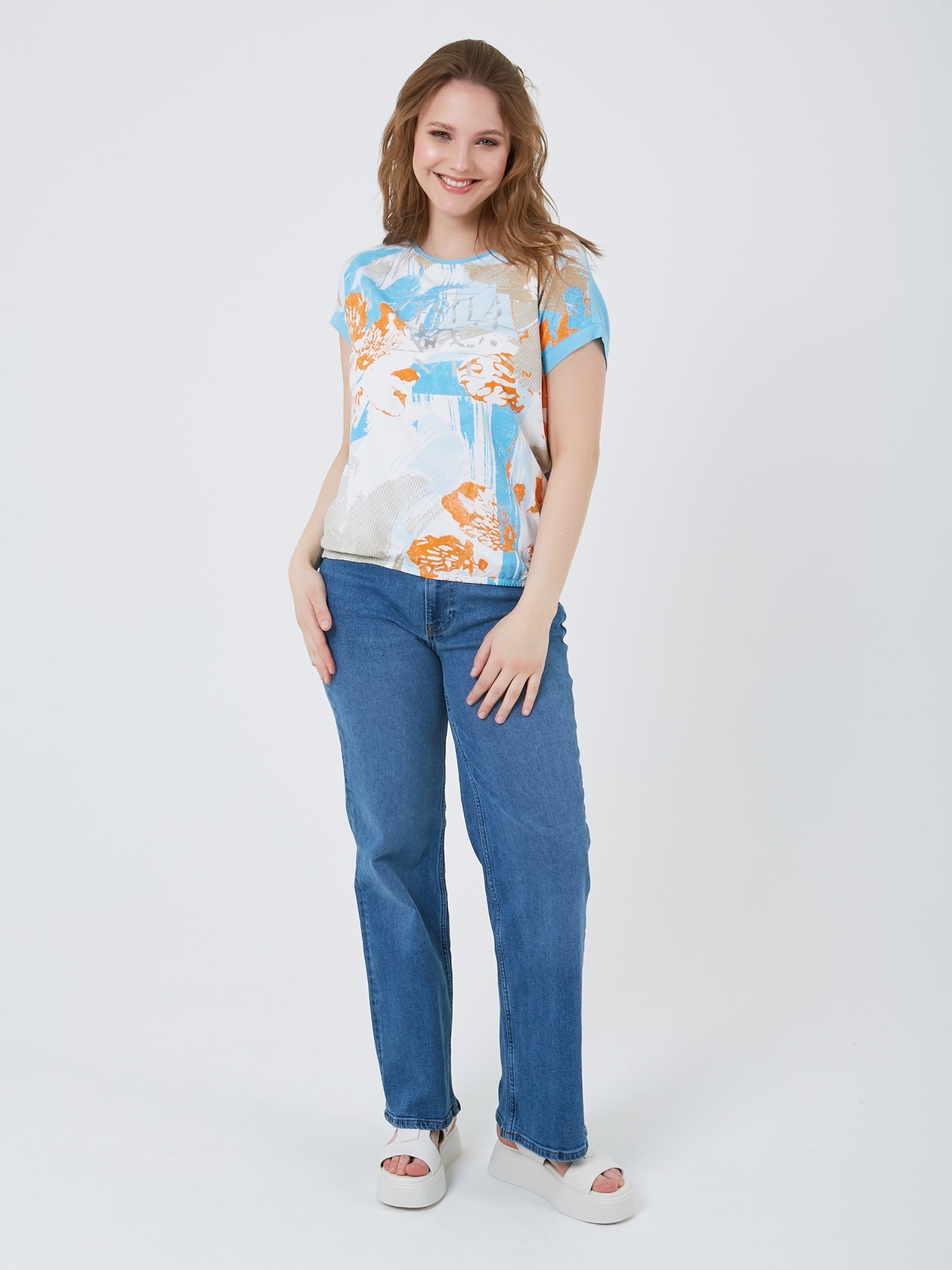 Футболка с резинкой по низу, украшена ярким принтом в нежных голубых и оранжевых тонах. Весна-Лето 2025. Капсула "Санторини". Параметры модели: 95-64-101, рост 175, размер 44-46