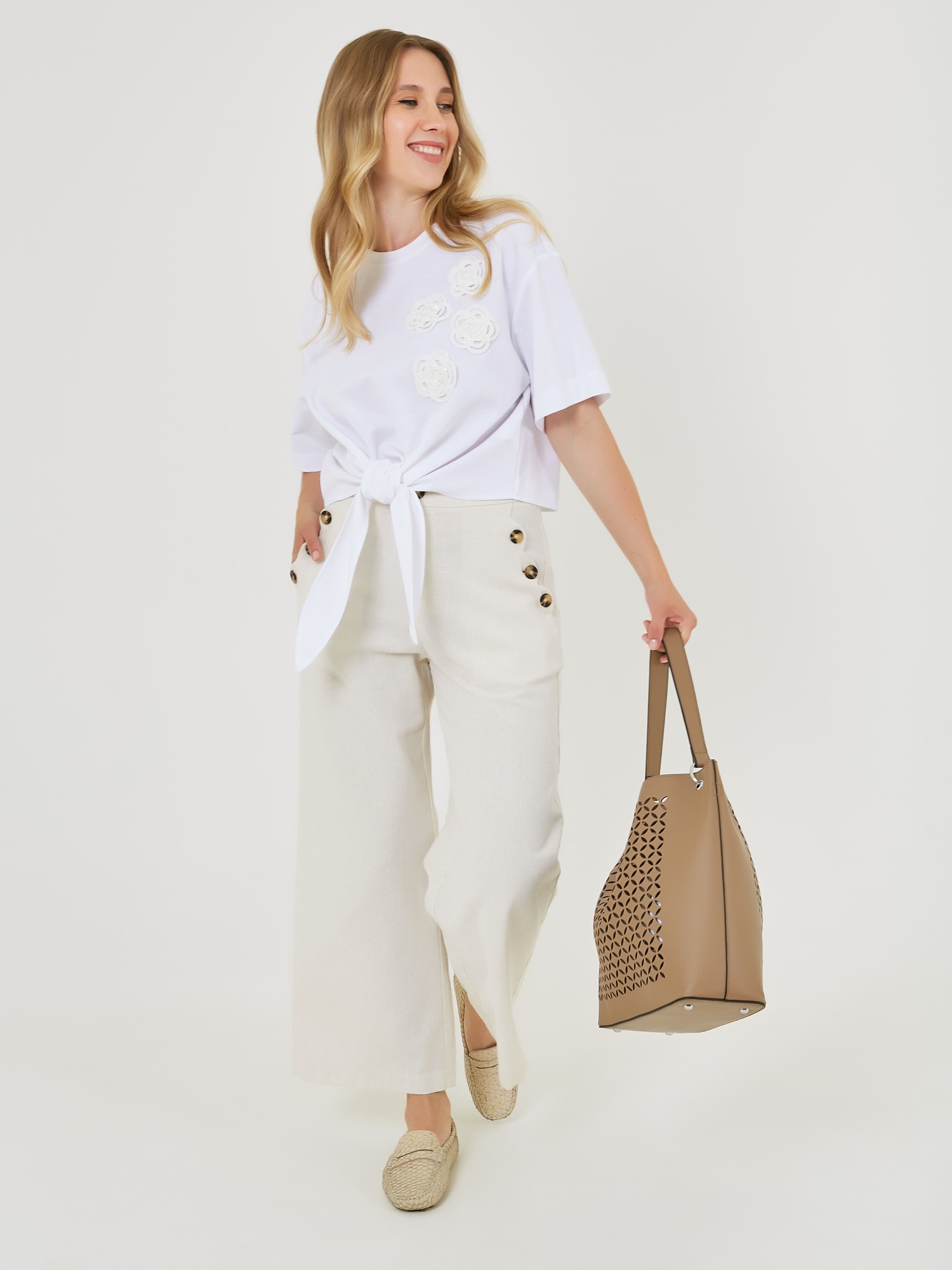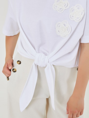 Белая футболка с завязкой на талии и декоративными цветочными аппликациями. Футболка имеет короткий рукав и круглый вырез горловины. Весна-Лето 2025. Капсула "Рио де Жанейро". Параметры модели: 89-70-92, рост 167, размер 44-46