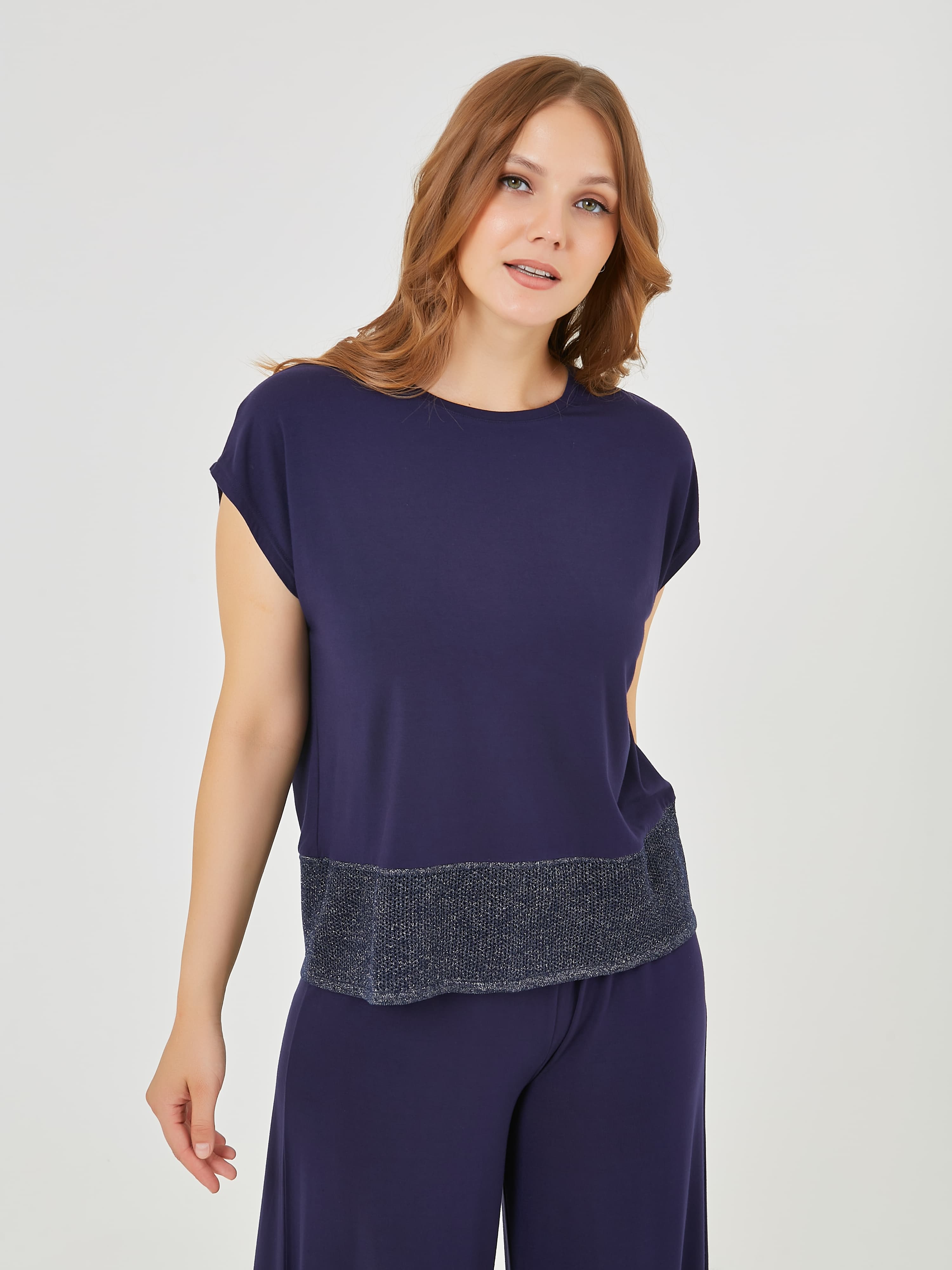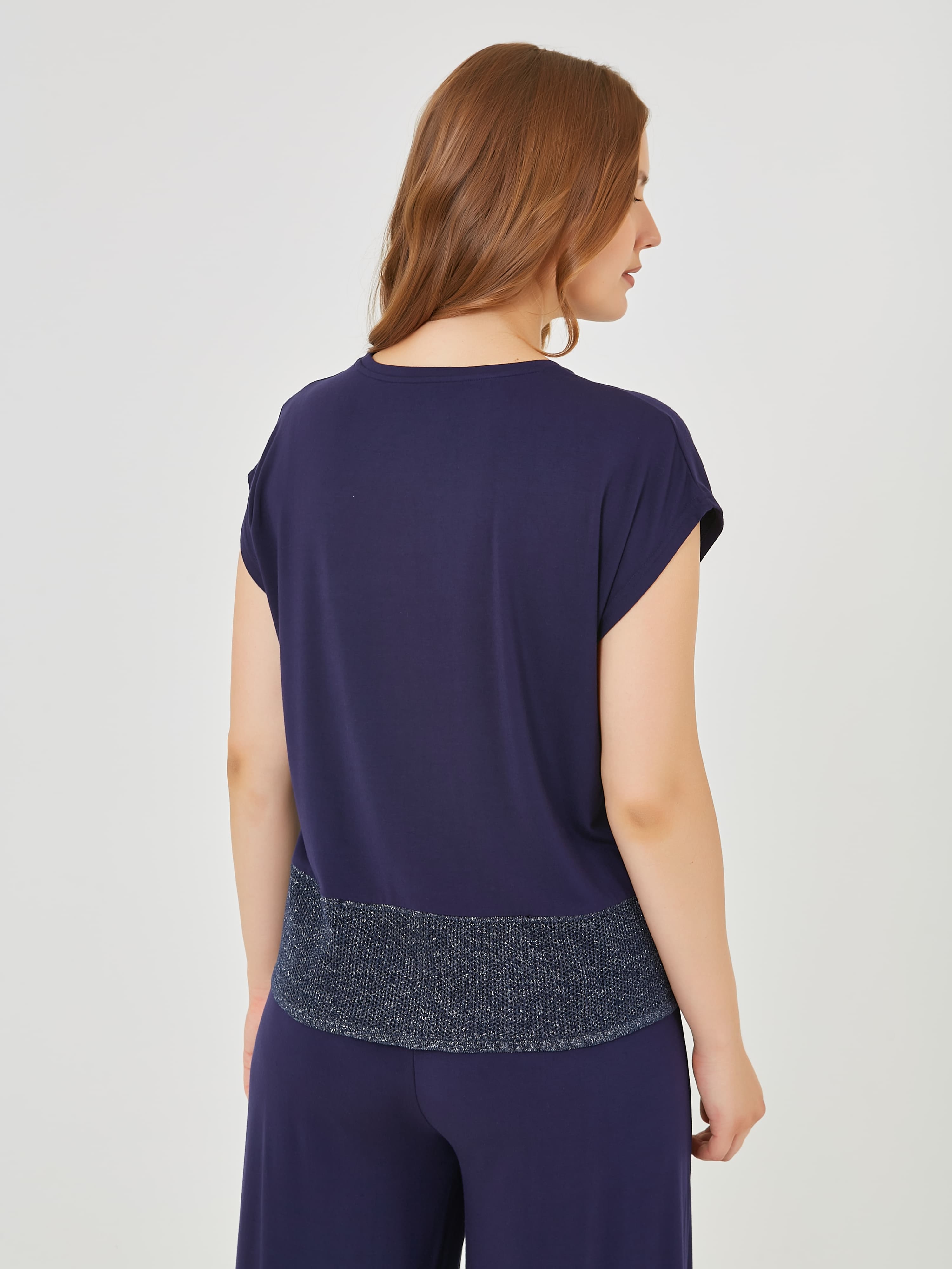 Стильная футболка глубокого синего цвета с короткими рукавами и текстурированным низом идеально сочетает комфорт и современный дизайн. Коллекция Весна-Лето 2025. Капсула "Самарканд". Параметры модели: 95-64-101, рост 175, размер 44-46