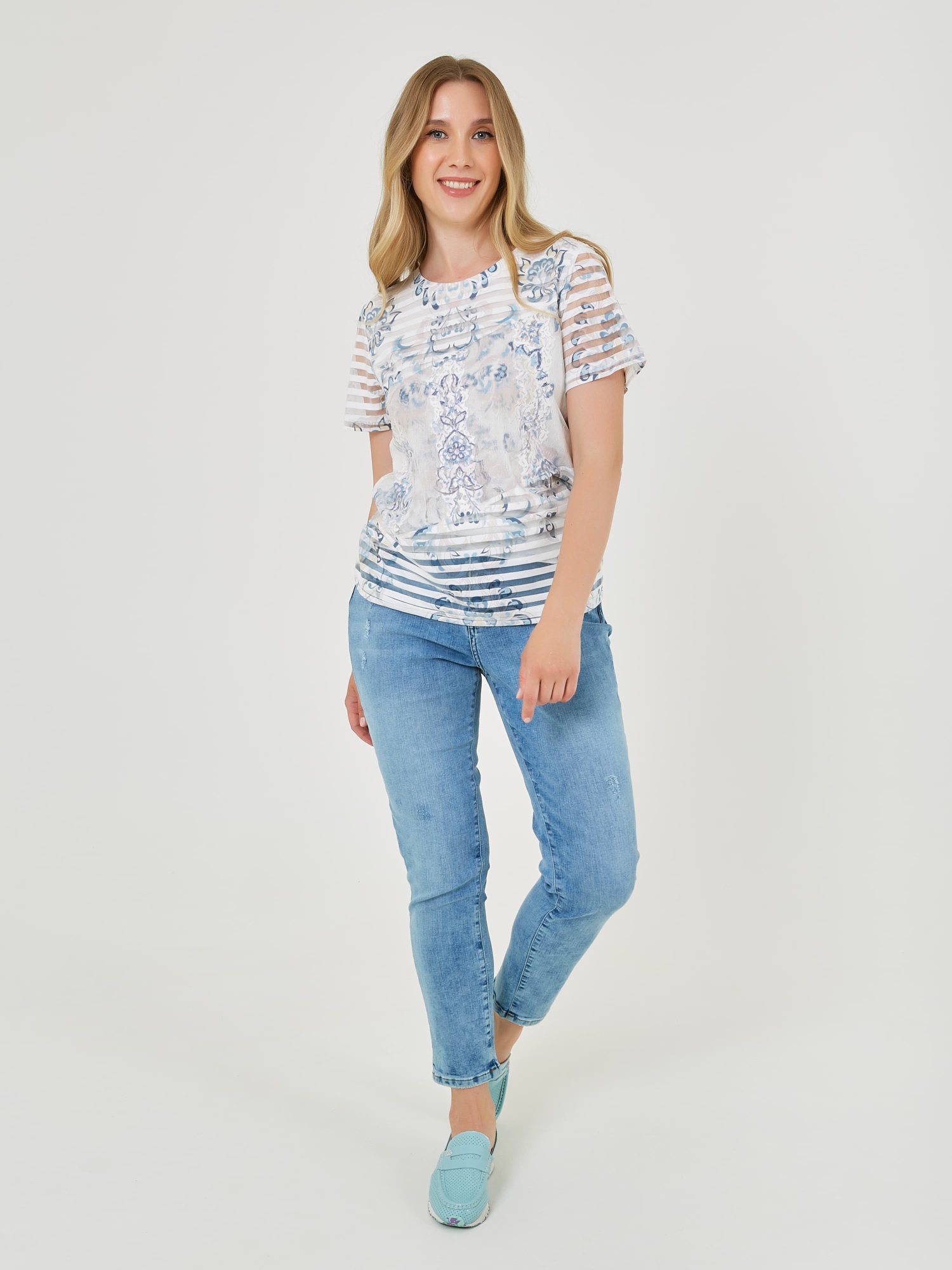 Футболка с короткими рукавами, сочетает белый цвет с голубыми и синими узорами, а полосатые рукава и цветочный принт добавляют уникальности. Коллекция Весна-Лето 2025. Капсула "Санторини". Параметры модели: 89-70-92, рост 167, размер 44-46