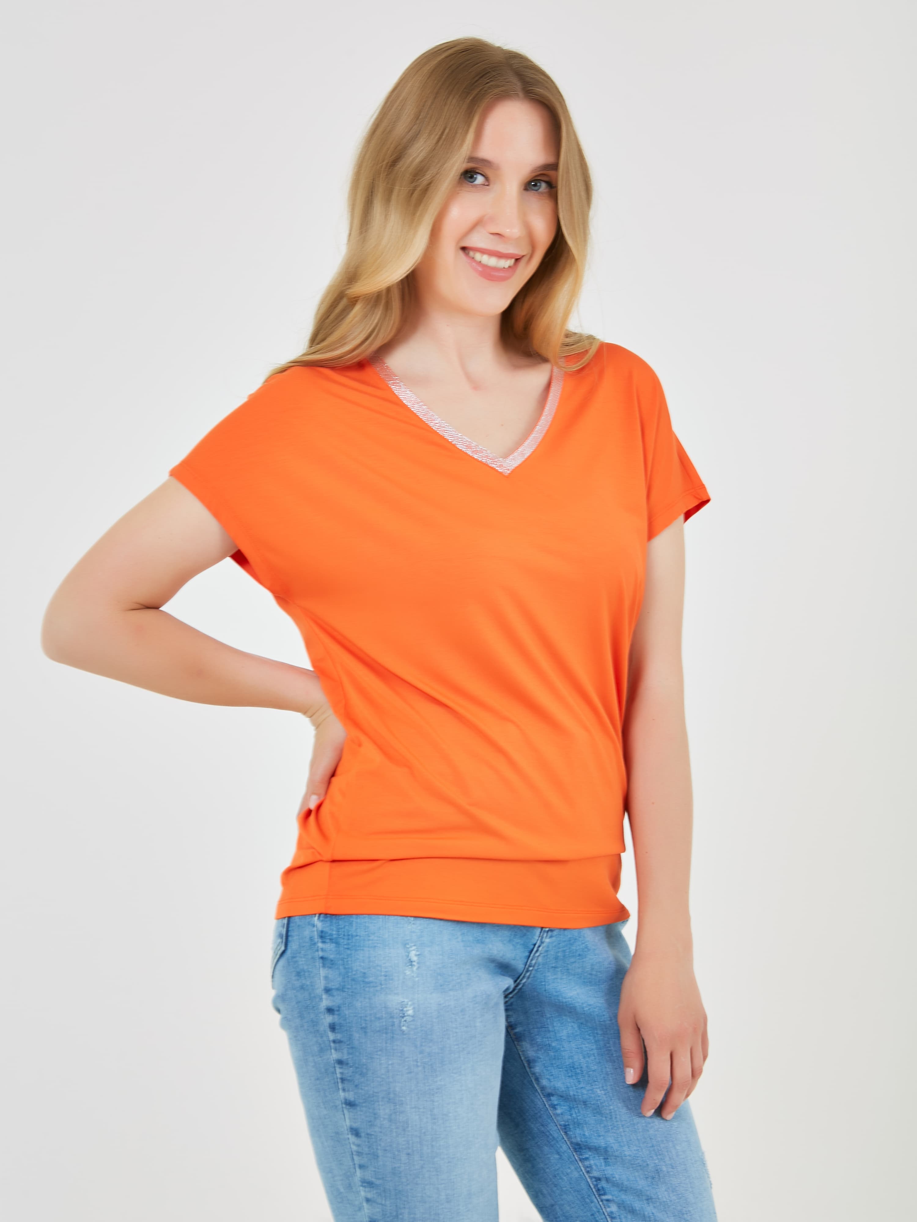 Яркая футболка с V-образным блестящим вырезом и свободным кроем. Коллекция Весна-Лето 2025. Капсула "Санторини". Параметры модели: 89-70-92, рост 167, размер 44-46
