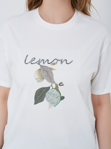 Футболка выполнена в белом цвете и украшена ярким принтом с изображением лимона. Модель имеет классический крой с круглым вырезом, что делает её подходящей для повседневной носки. Коллекция Весна-Лето 2025. Капсула "Рио де Жанейро". Параметры модели: 95-64-101, рост 175, размер 44-46