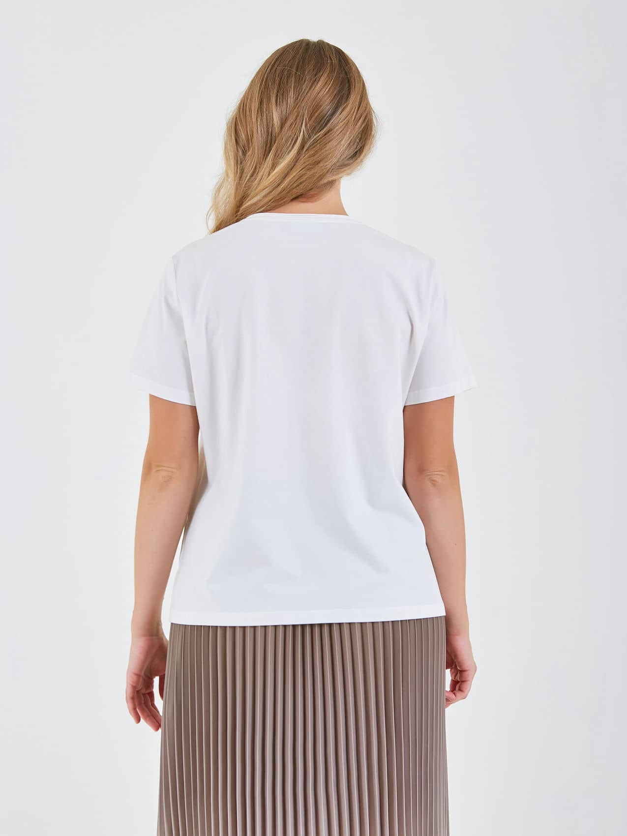 Футболка белого цвета с ярким принтом, на котором изображены цветы с надписями. Ненавязчивый текст на принте и V-образный вырез придают изделию стильный и женственный вид, идеально подходящий для повседневной носки. Коллекция Весна-Лето 2025. Капсула "Рио де Жанейро". Параметры модели: 89-70-92, рост 167, размер 44-46