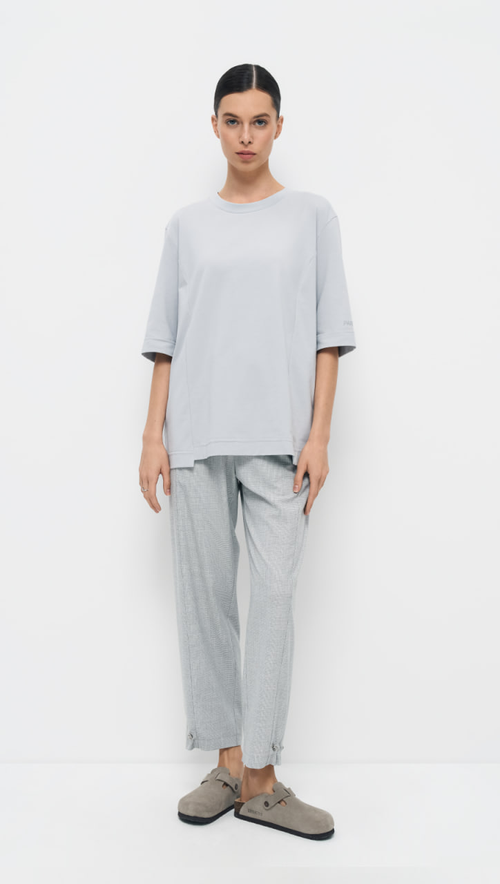 Блуза прямого силуэта из мягкого хлопка с добавлением эластана в спокойном цвете «серый мел» привлекает внимание благодаря своему уникальному дизайну. Полочка украшена двумя вертикальными рельефами, в которые заложена нагрудная вытачка, подчеркивающая изящную линию груди. Втачные одношовные рукава, длиной чуть ниже линии локтя, дополняют гармоничный силуэт и делают образ элегантным и утонченным. Объемная печать на рукаве, выполненная в тон основному материалу, несет в себе девиз коллекции, придавая изделию особую значимость и индивидуальность.