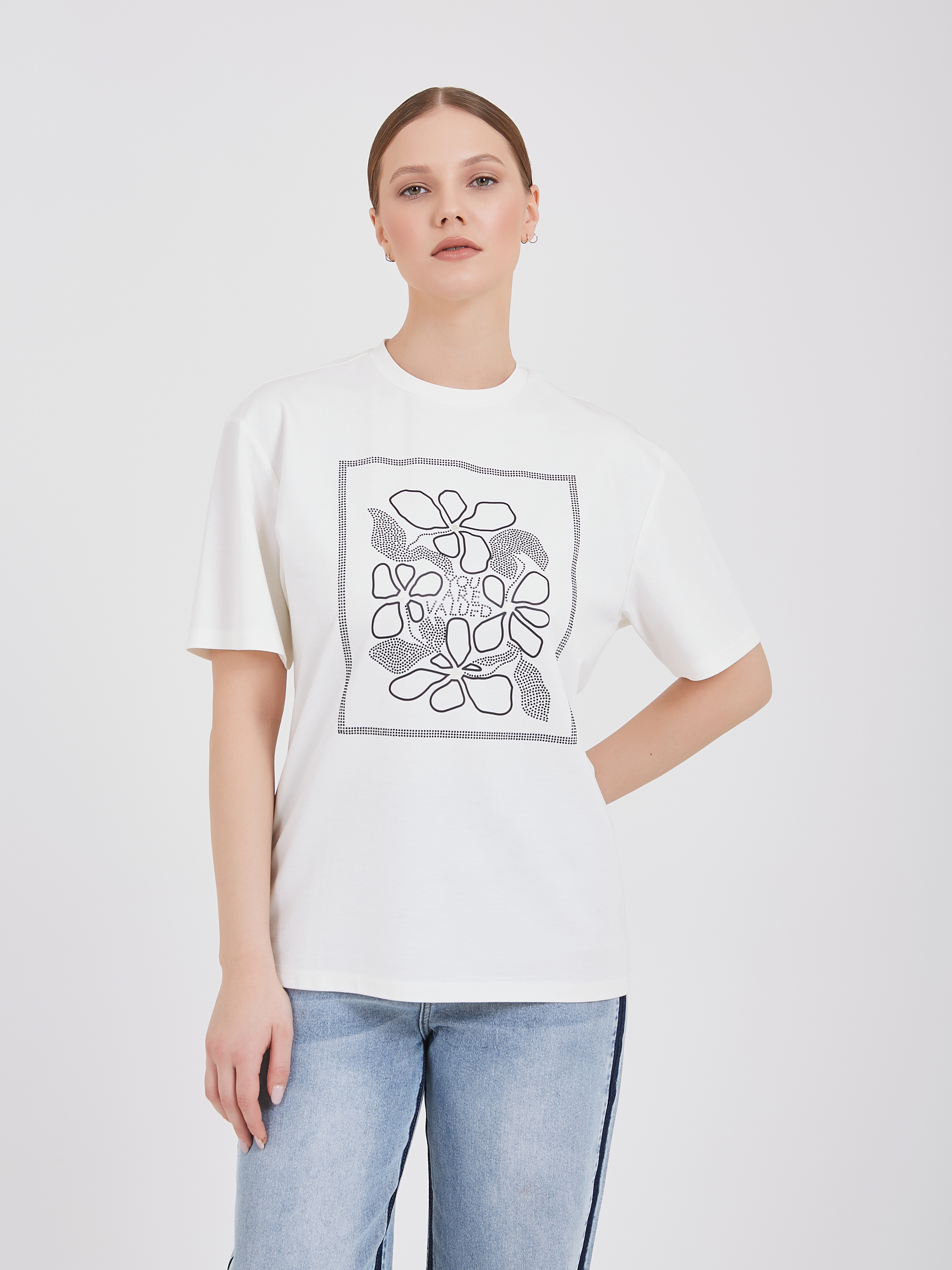 Футболка обладает классическим втачным рукавом и выполнена из более плотного трикотажа, чем летние варианты. Благородный чернильно-чёрный оттенок выгодно подчёркивает оригинальную аппликацию из золотых страз, придавая изделию дороговизну и шик. Футболка подойдёт женщинам разных фигур, идеально вписываясь в городской стиль и позволяя создать стильный и утончённый образ.