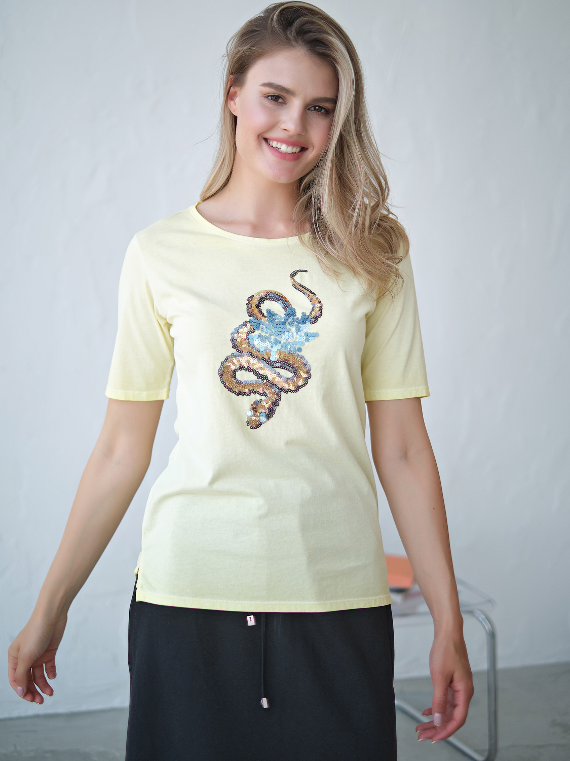 Ткань из натуральных материалов обеспечит комфорт и прохладу жарким летом. Прямой покрой скроет недостатки фигуры. Круглый вырез горловины создает женственный образ. Футболка украшена вышивкой из пайеток. Данная модель будет хорошо сочетаться с брючным комплектом.