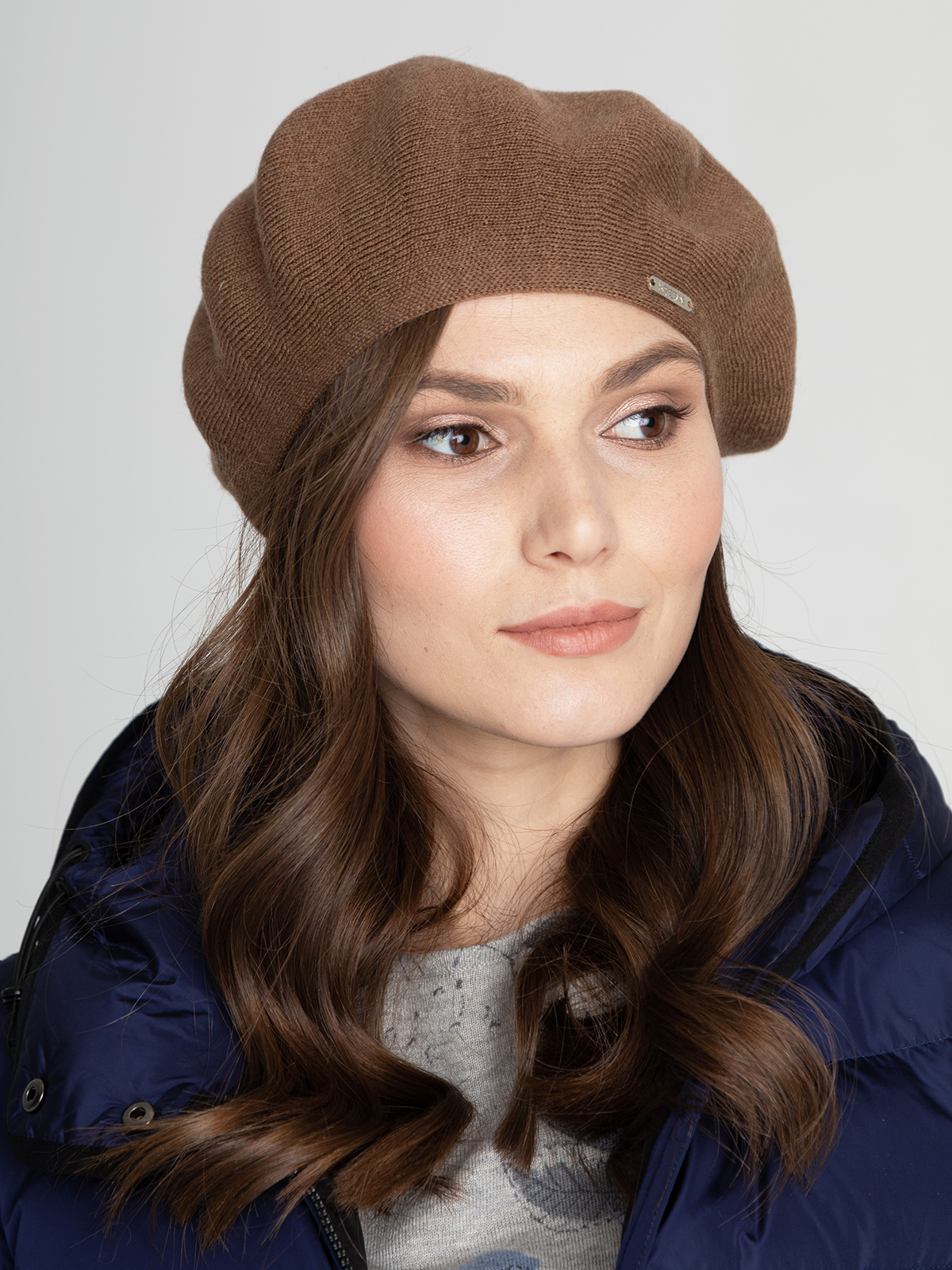 Вязаный берет с выполнен в нежном оттенке. Модель универсальна, подходит для любого типа лица. Украшение в виде металлического лейбла.