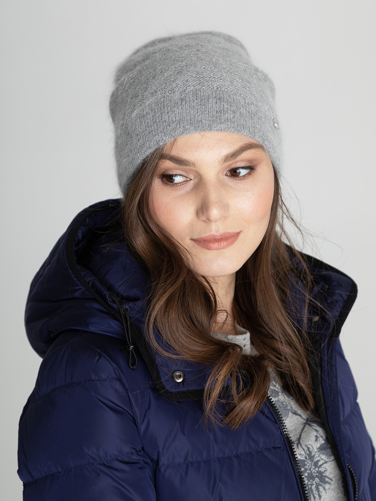 Однотонная шапочка-бини из ангоры с добавлением смесовой шерсти. Нить люрекса обеспечивает приятный блеск. Шапка хорошо сохраняет тепло и подходит для любого овала лица.