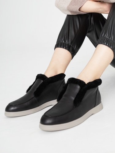 Короткие зимние ботинки из велюра черного оттенка на плоской контрастной подошве. Оторочка из натурального меха в тон. Ботинки отлично дополнят повседневный образ из теплого спортивного костюма, также выигрышно будут смотреться с джинсами или джоггерами.