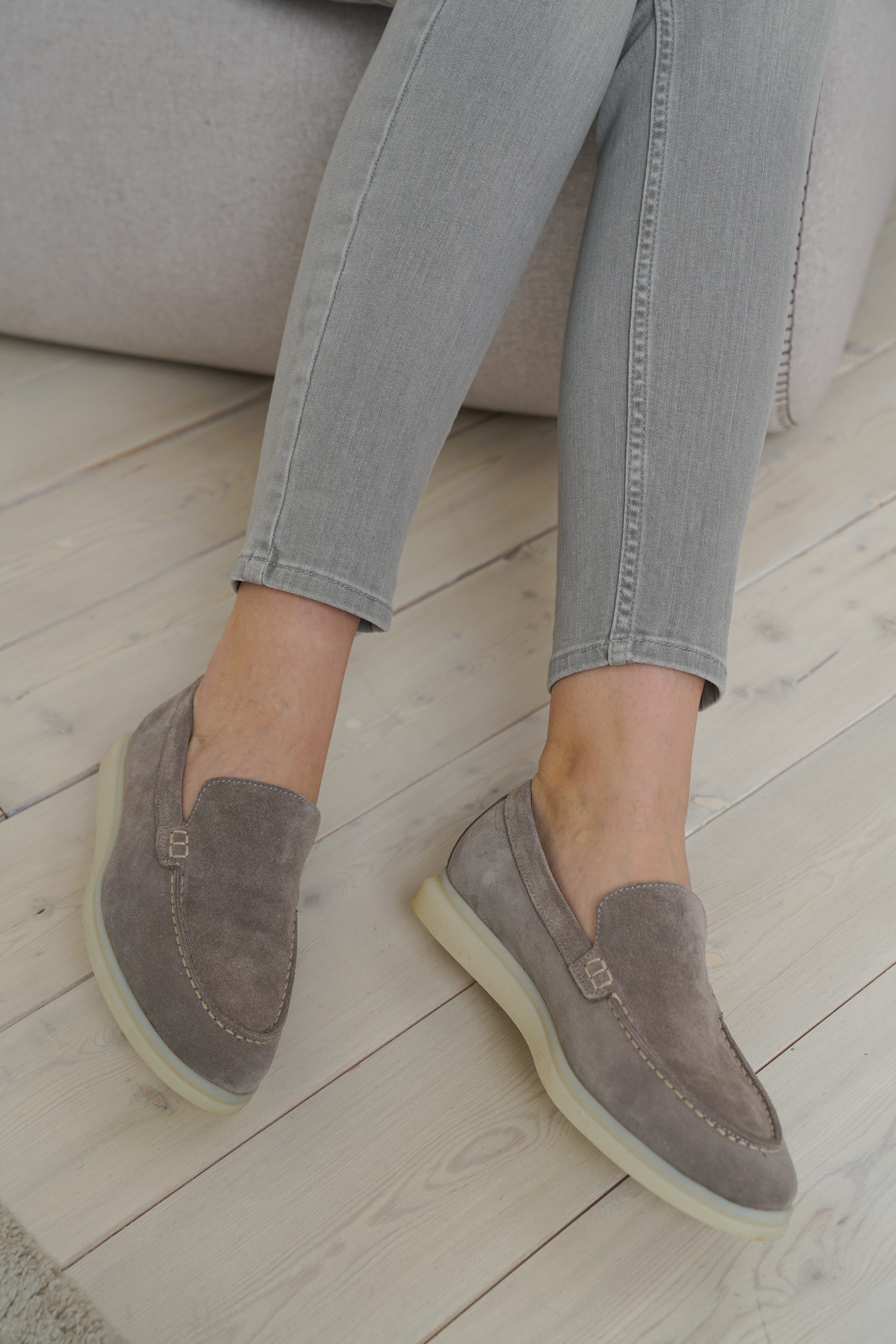 Серо-бежевые замшевые кожаные женские лоферы. Изготовлено из высококачественной телячьей кожи. Bысота подошвы: 2 см. Резиновая подошва. Ручная работа.