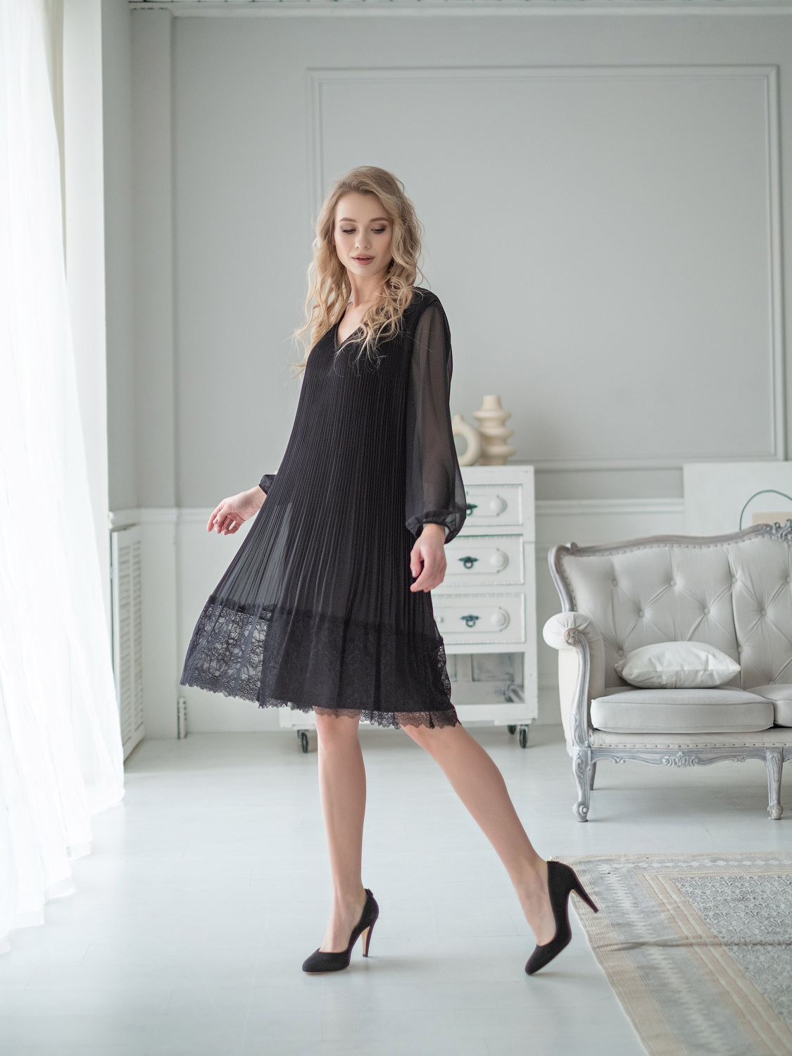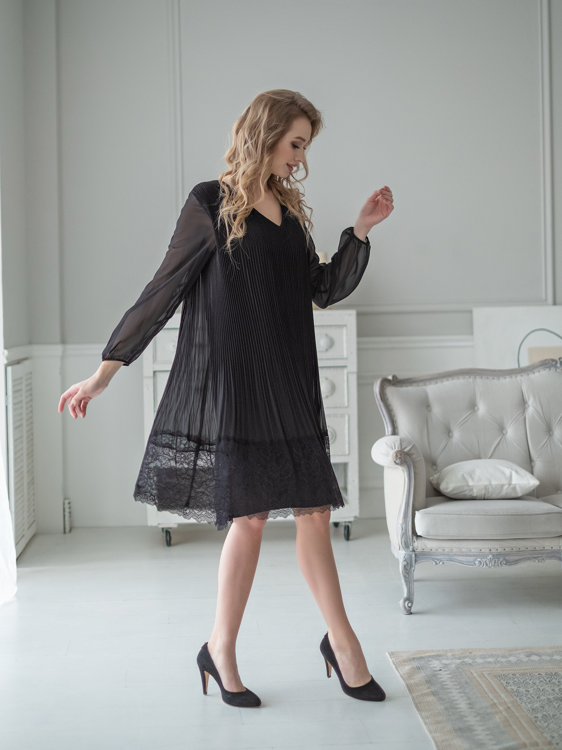 Плиссированное платье-трапеция, украшенное кружевом по низу изделия, идеально сгладит любые недостатки фигуры и подчеркнет достоинства. V-образный вырез, рукав епископа, длина платья – до середины колена.