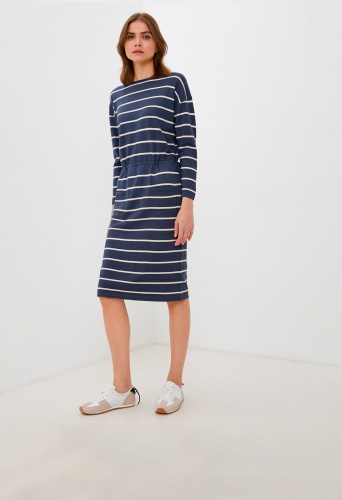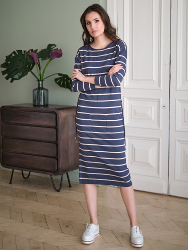 На сайте указаны Российские размеры. Платье длины миди в полоску станет частью повседневного городского образа. Материал из смеси вискозы и нейлона приятен к телу и обеспечивает комфортное ношение. Кулиска на талии. Овальный вырез горловины. Втачной рукав полной длины.