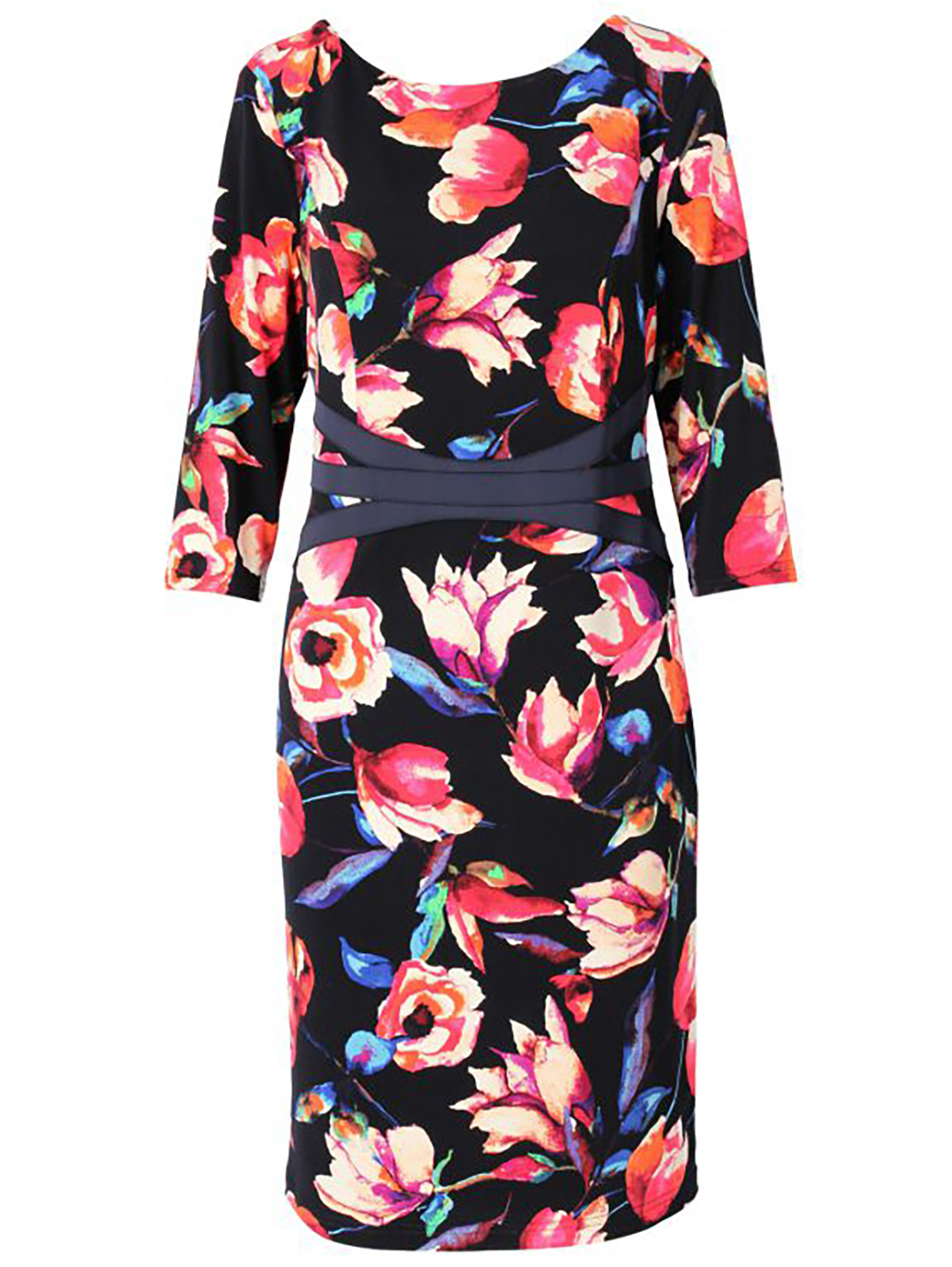 Платье миди с цветочным узором по всей поверхности изделия. Приталенный силуэт, длина до колена. Овальная горловина, V-образный вырез на спинке, втачной рукав 3/4.