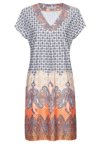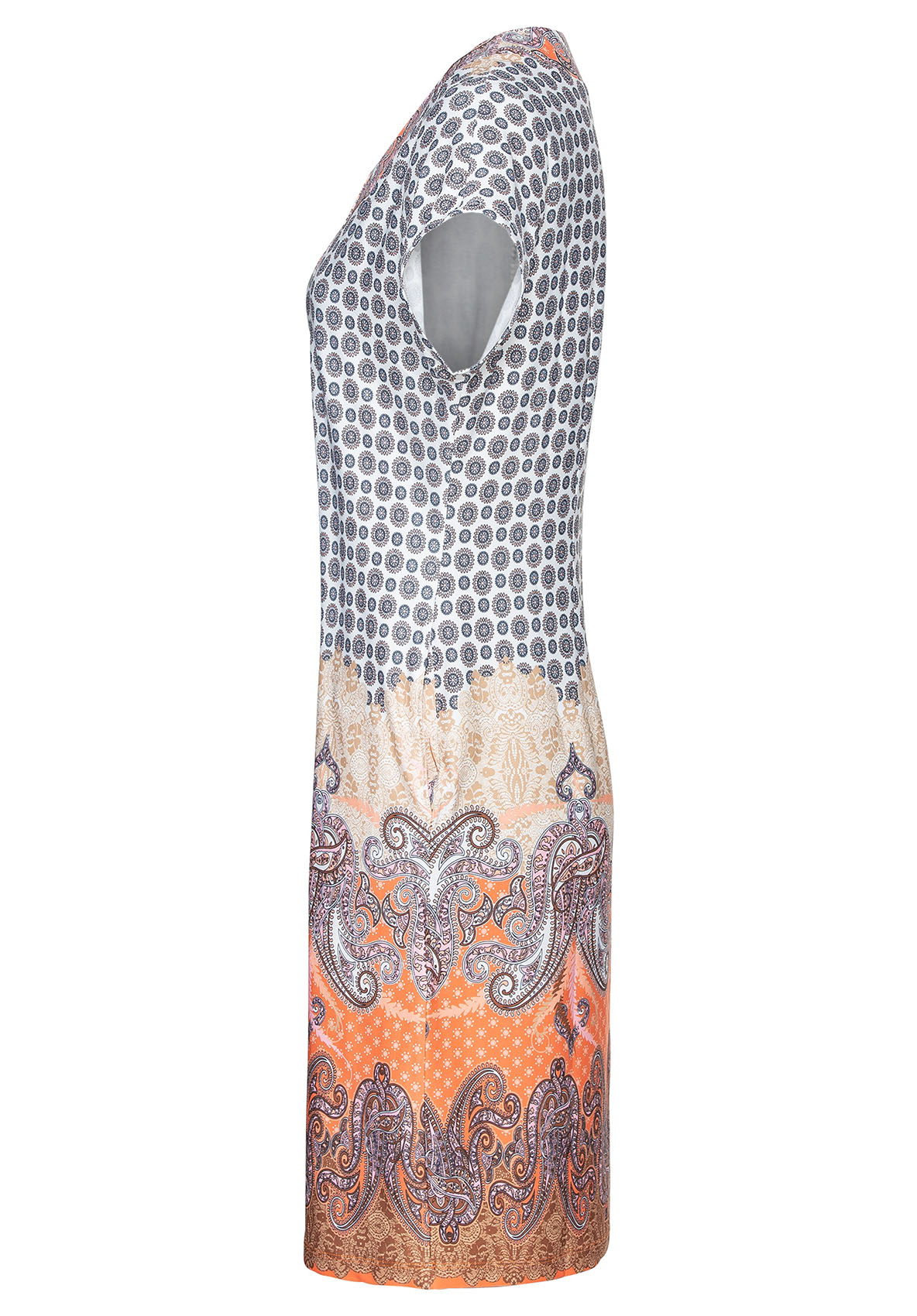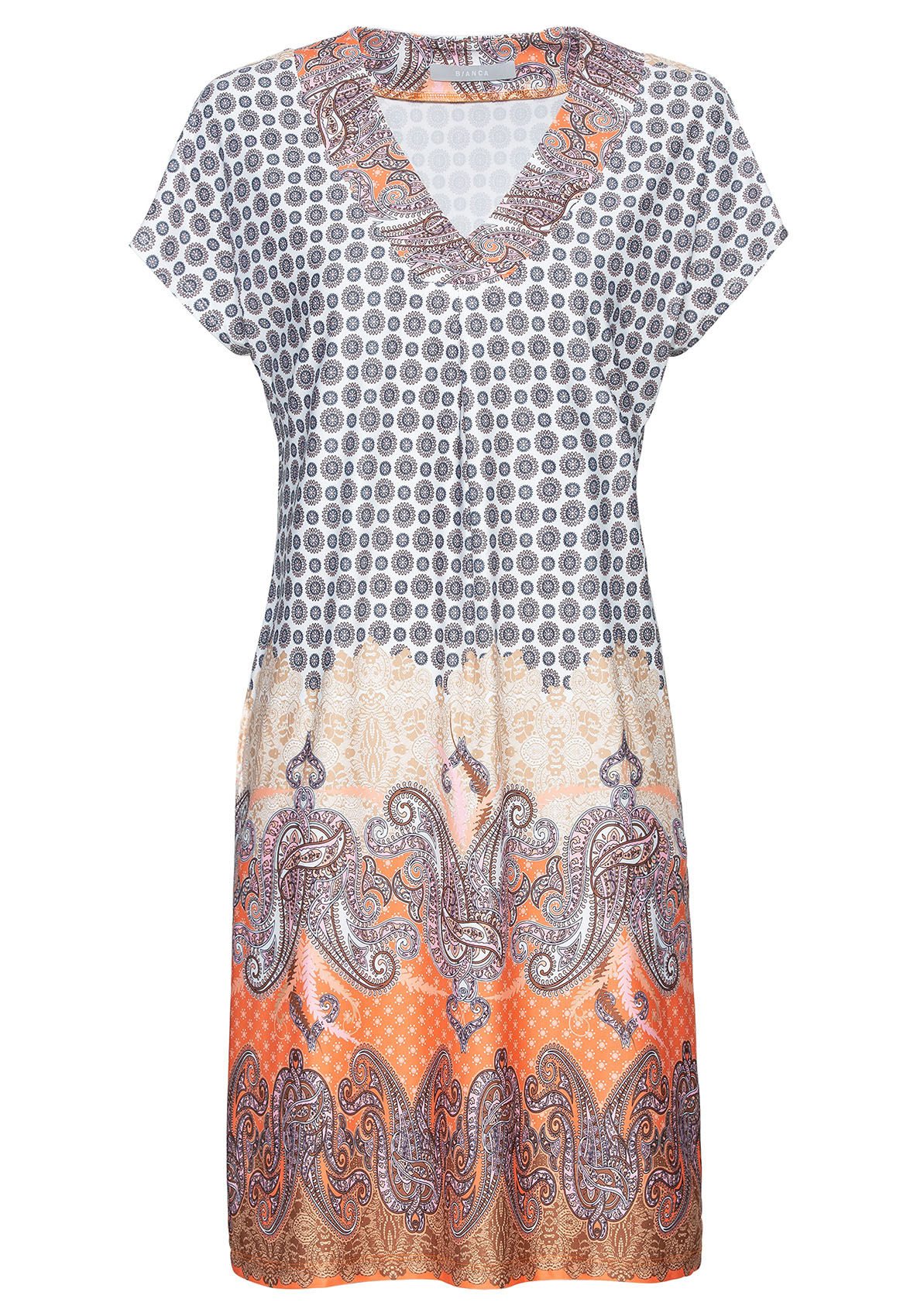 Модное платье Marill привносит сочные цвета и изысканность в ваш гардероб: благодаря модному принту и удобству в ношении платье из джерси станет просто необходимым в этом сезоне. Сочетание узоров создает стильные контрасты: принт "пейсли" дополняется модным орнаментом. В дизайне множество интересных деталей: V-образным вырез, цельнокроеные рукава, декоративная складка под грудью, карманы в боковых швах. Платье прекрасно сочетается с обычными кроссовками и кардиганом. • платье без подкладки с принтом пейсли • струящаяся эластичная трикотажная ткань • складка под грудью, V-образный вырез, карманы • длина 97 см, рост модели - около 180 см • на рост 168 см платье будет длиной до колен