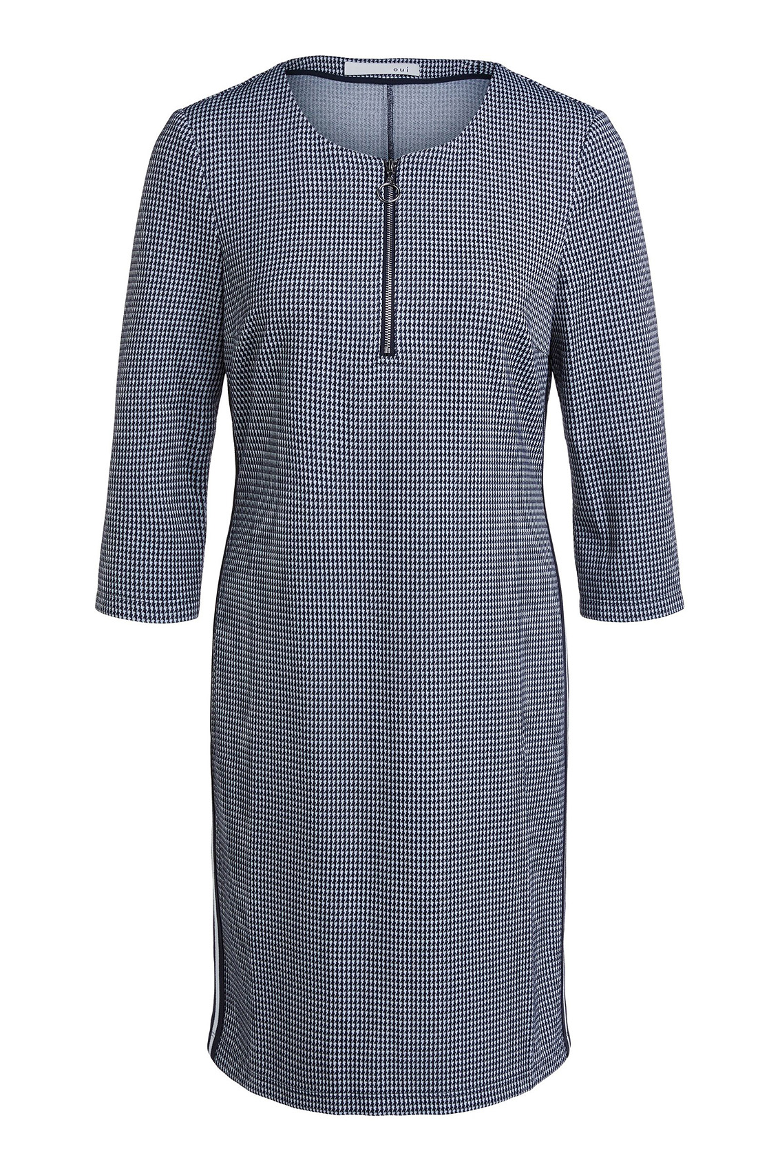 Платье - необходимая модель женского гардероба. Приталенный крой подчеркивает достоинства фигуры. Круглый вырез горловины, застежка-молния спереди. Рукава 3/4. Декоративная тесьма вдоль боковых швов. Классический клетчатый орнамент "гусиная лапка". Эта модель великолепно смотрится как с обувью на плоском ходу.