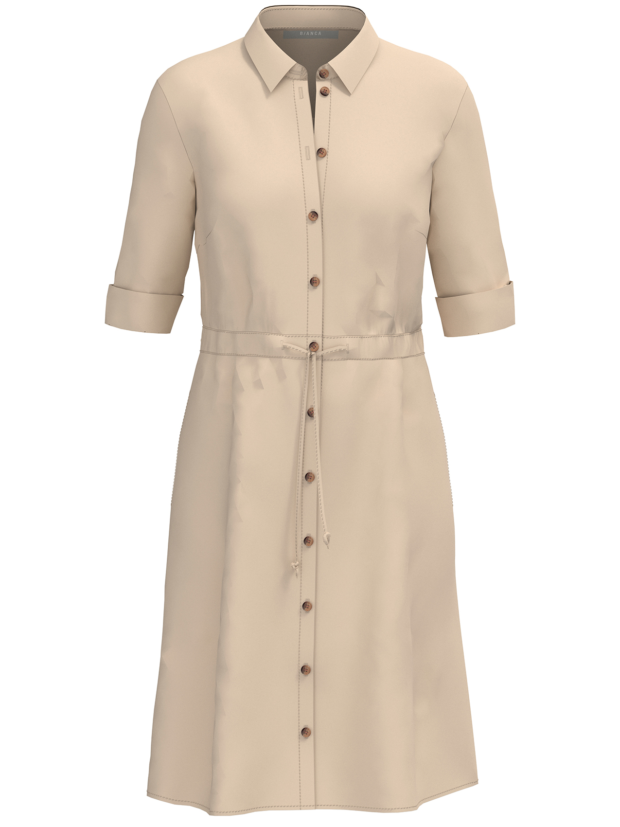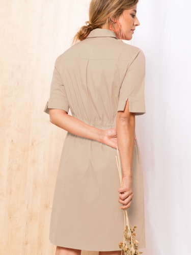 Однотонное платье в базовой расцветке идеально подходит для жаркой летней погоды. Кулиска на поясе позволяет сделать силуэт приталенным. Отложной рубашечный воротник, планка с контрастными пуговицами. Втачной рукав с подворотами.