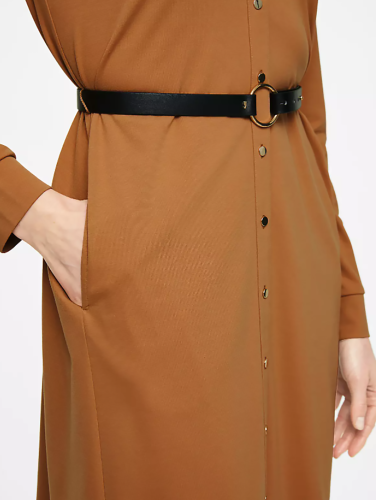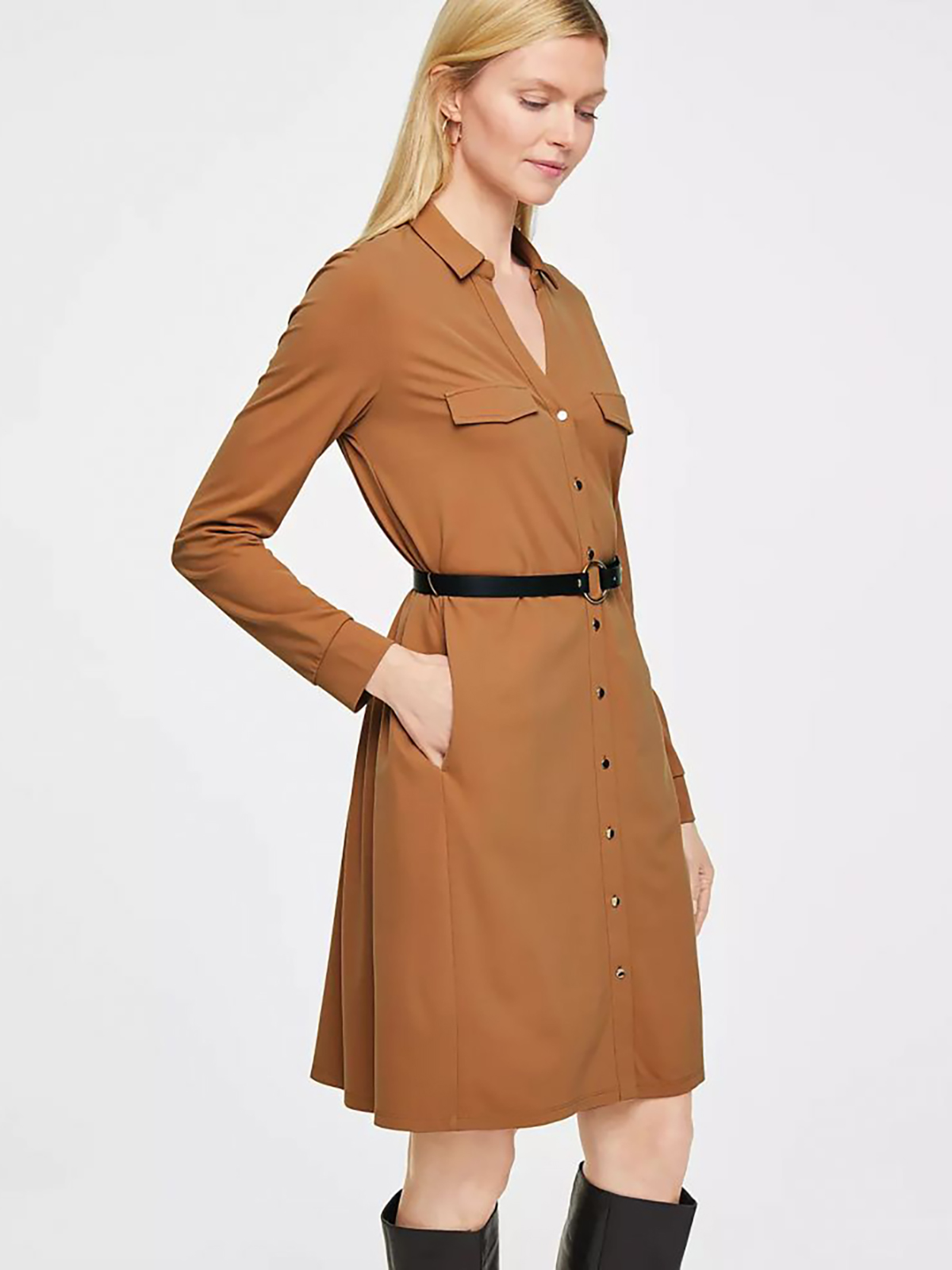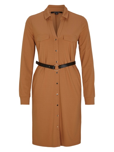 Однотонное платье-рубашка длиной выше колена. Платье подойдет для создания делового образа. Отложной рубашечный воротник, планка с пуговицами. Ложные карманы на груди с клапанами. Втачной рукав полной длины с манжетой. В комплекте идет контрастный ремень из экокожи.