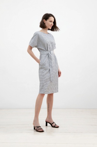 Российский бренд. На сайте указаны Российские размеры. Женственное платье из фактурной вискозной ткани в черно-белом принте полуприлегающего силуэта с горловиной лодочка и коротким рукавом кимоно. На талии съемный пояс из ткани с полукольцами.