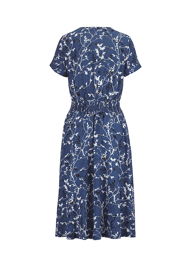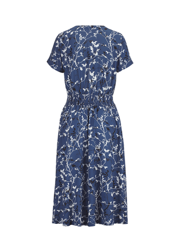 Модное платье миди из струящейся мягкой вискозы. V-образный вырез, короткие рукава и разрез на юбке. На талии присборенная вставка и тканевый пояс.